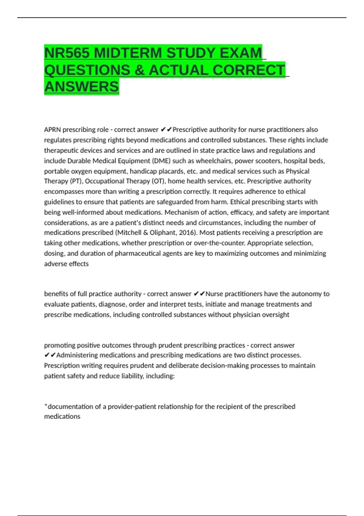 NR565 MIDTERM STUDY EXAM QUESTIONS & ACTUAL CORRECT ANSWERS