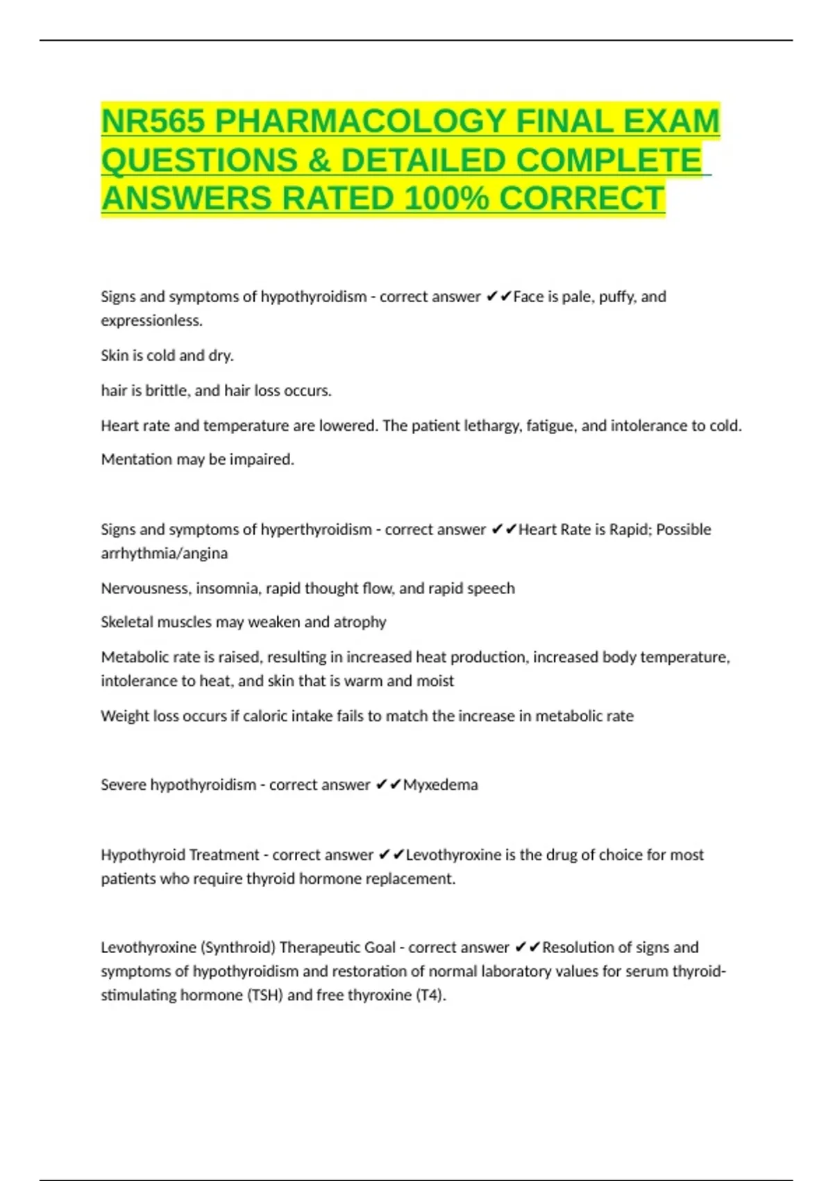 Levothyroxine (Synthroid) Therapeutic Goal - correct answer ✔✔Resolution of signs and