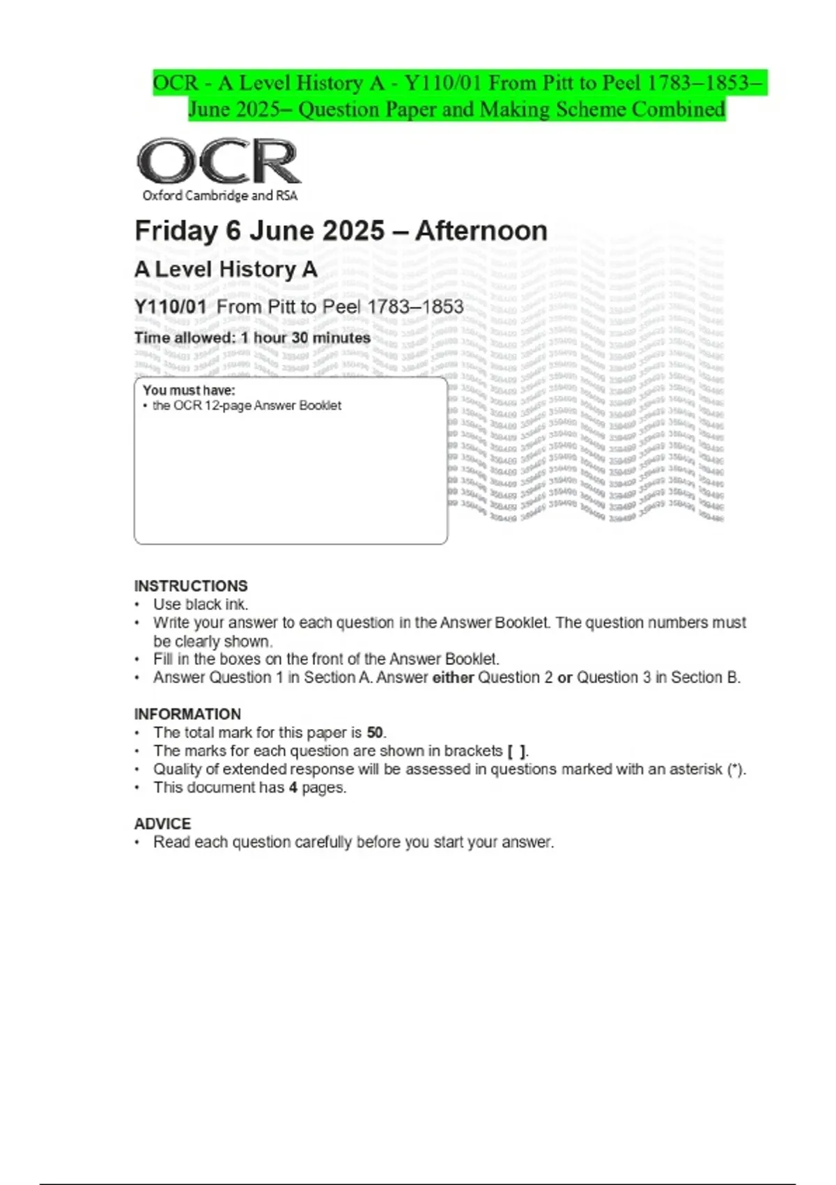 OCR - A Level History A - Y110/01 From Pitt to Peel - June 2025- Question Paper and Making Scheme Combined