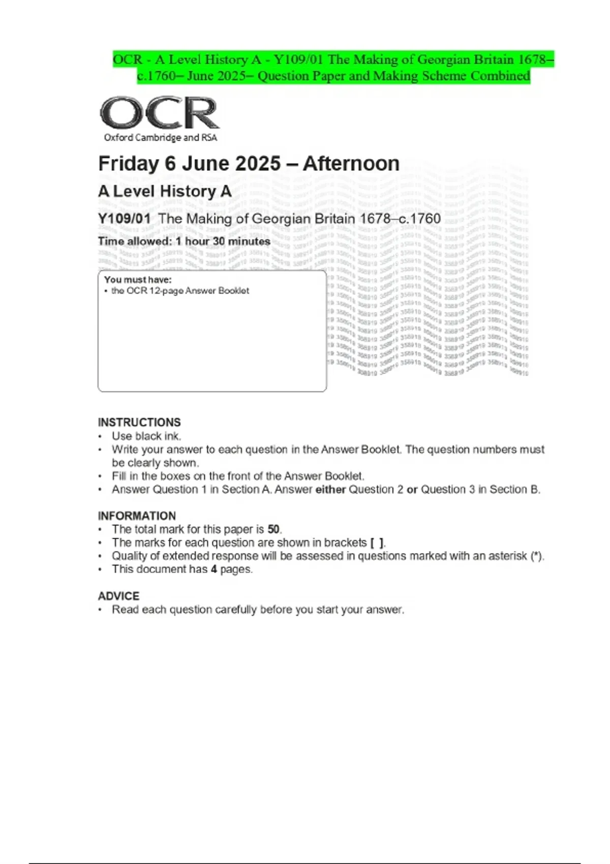 OCR - A Level History A - Y109/01 The Making of Georgian Britain 1678- c.1760- June 2025- Question Paper and Making Scheme Combined