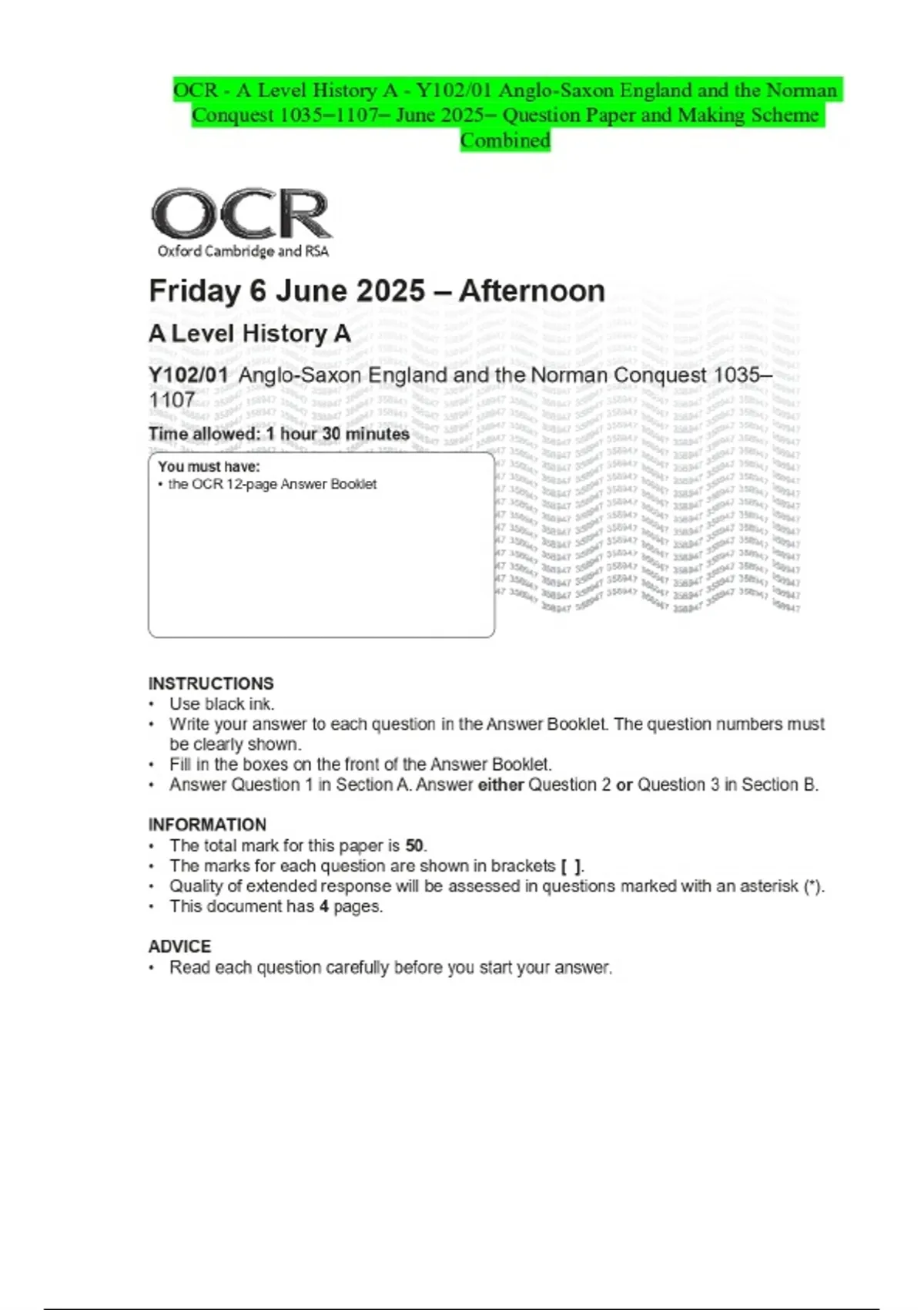 OCR - A Level History A - Y102/01 Anglo-Saxon England and the Norman Conquest - June 2025- Question Paper and Making Scheme Combined