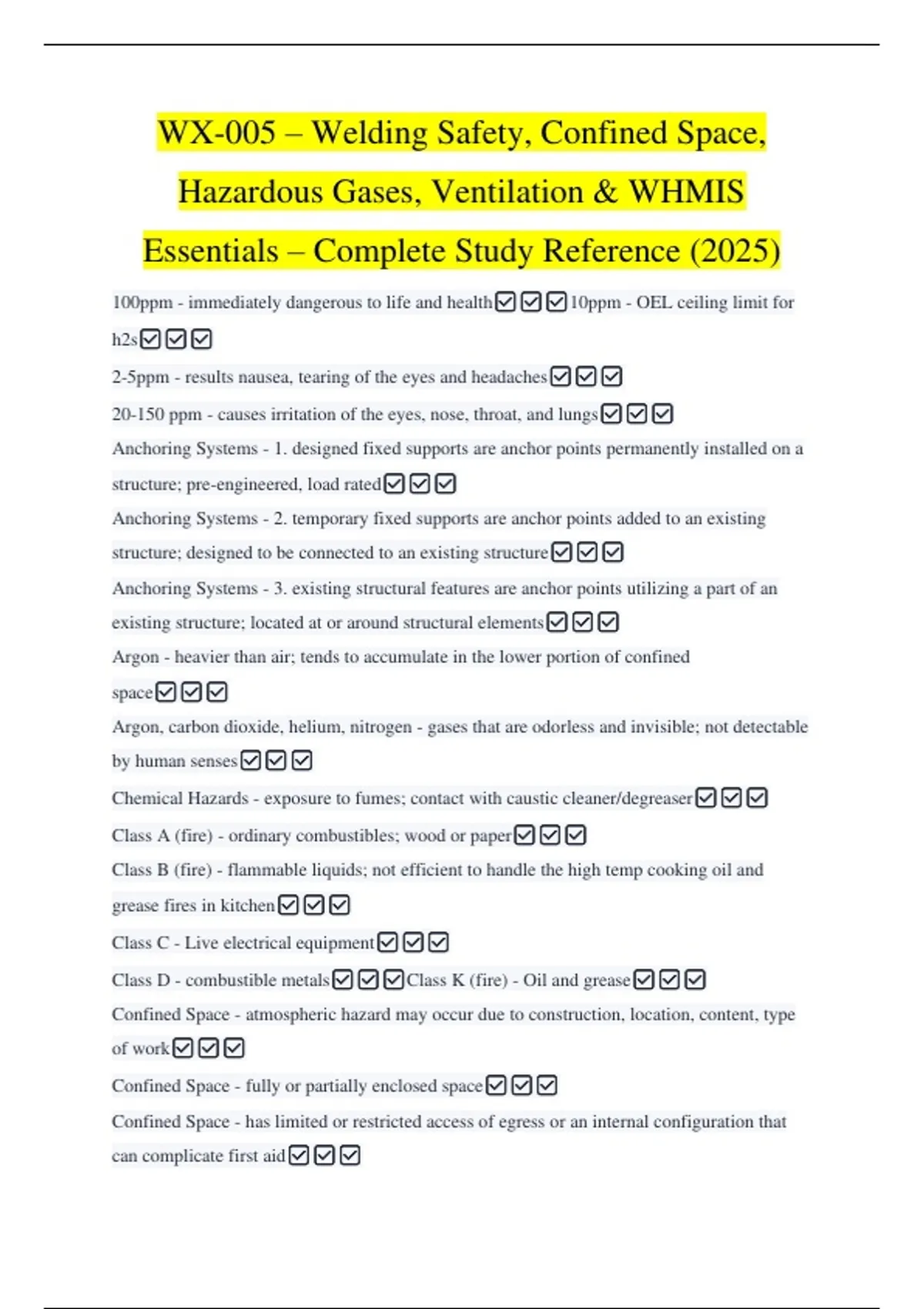 This document compiles comprehensive safety-related knowledge essential for welding, fabrication, and industrial environments. It covers hazardous gases (H₂S, ozone, argon, helium), TLVs and exposure limits, confined space requirements, WHMIS classifications, radiation hazards, ventilation types, fire classes, fall protection systems, lockout/tagout procedures, emergency response, PPE, and jobsite hazard assessments. The material provides clear definitions, hazard descriptions, exposure symptoms, and control measures, making it a strong study resource for safety certifications, welding inspector training, and workplace safety programs.