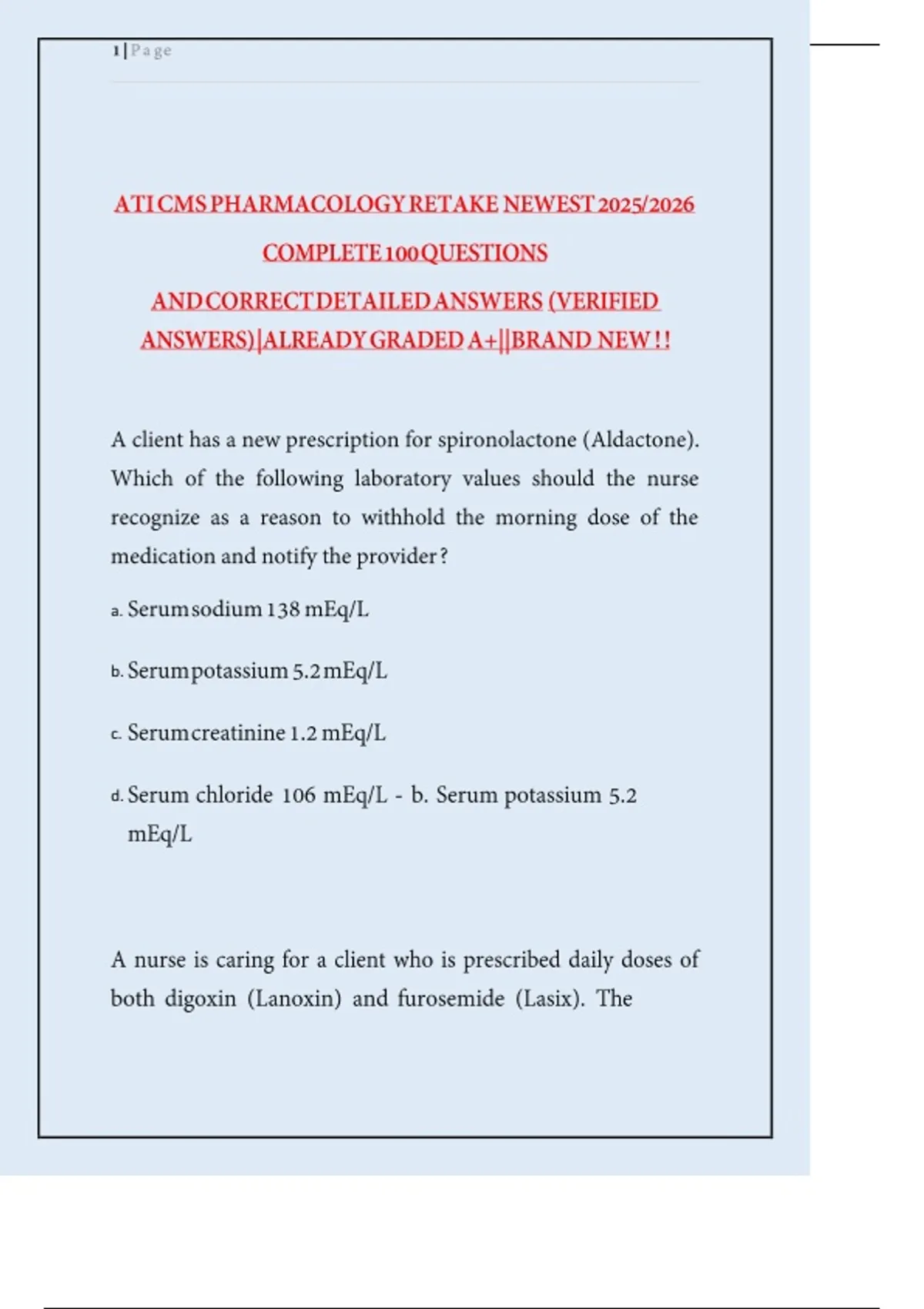 d. Serum chloride 106 mEq/L - b. Serum potassium5.2