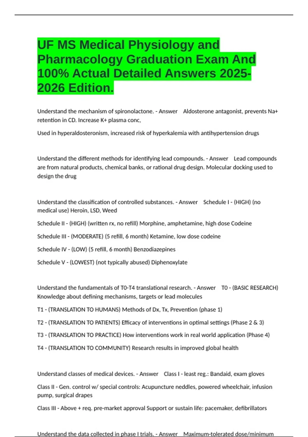 UF MS Medical Physiology and Pharmacology Graduation Exam And 100% Actual Detailed Answers Edition.