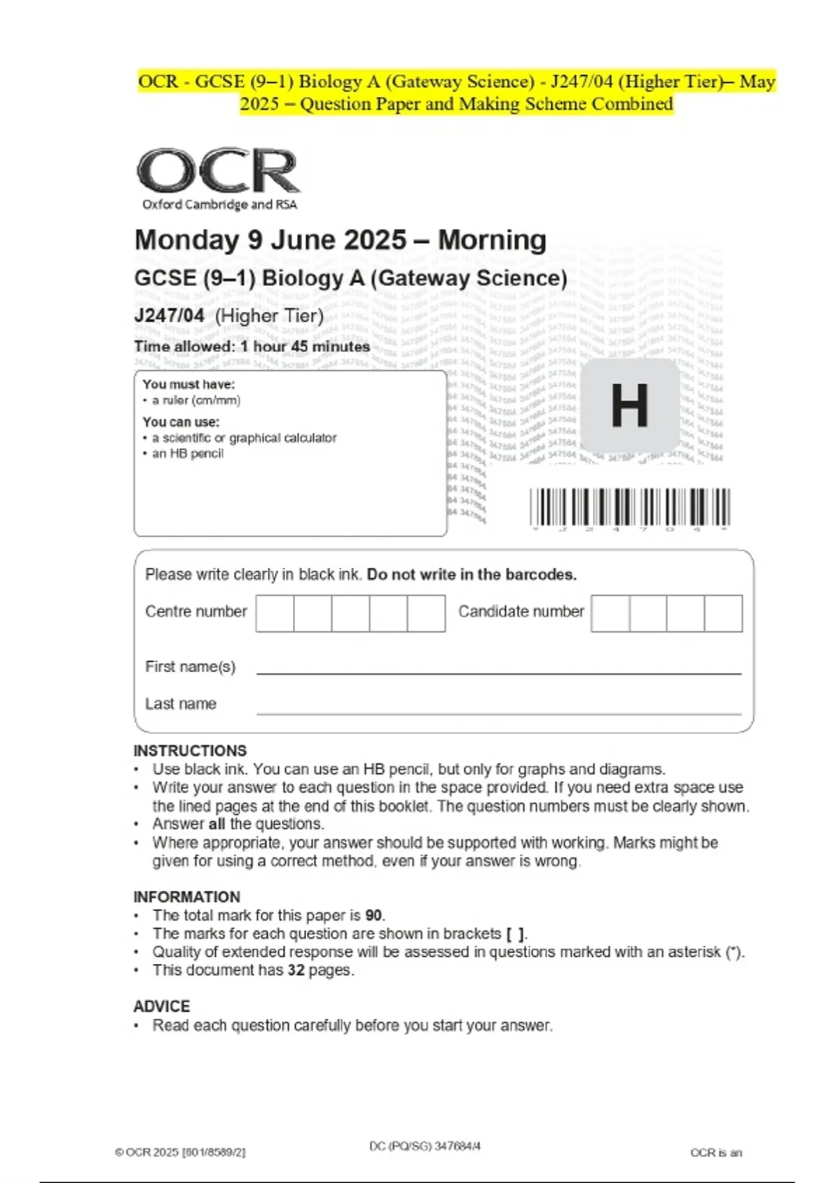 OCR - GCSE (9–1) Biology A (Gateway Science) - J247/04 (Higher Tier)- May 2025 - Question Paper and Making Scheme Combined