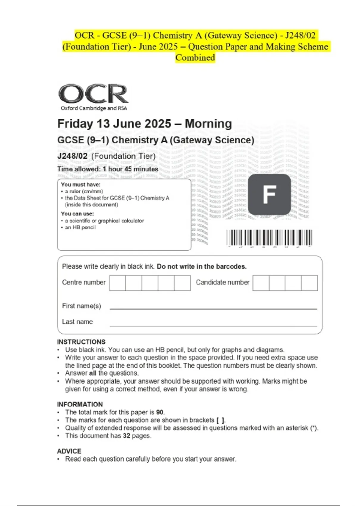 OCR - GCSE (9–1) Chemistry A (Gateway Science) - J248/02 (Foundation Tier) - June 2025 – Question Paper and Making Scheme Combined