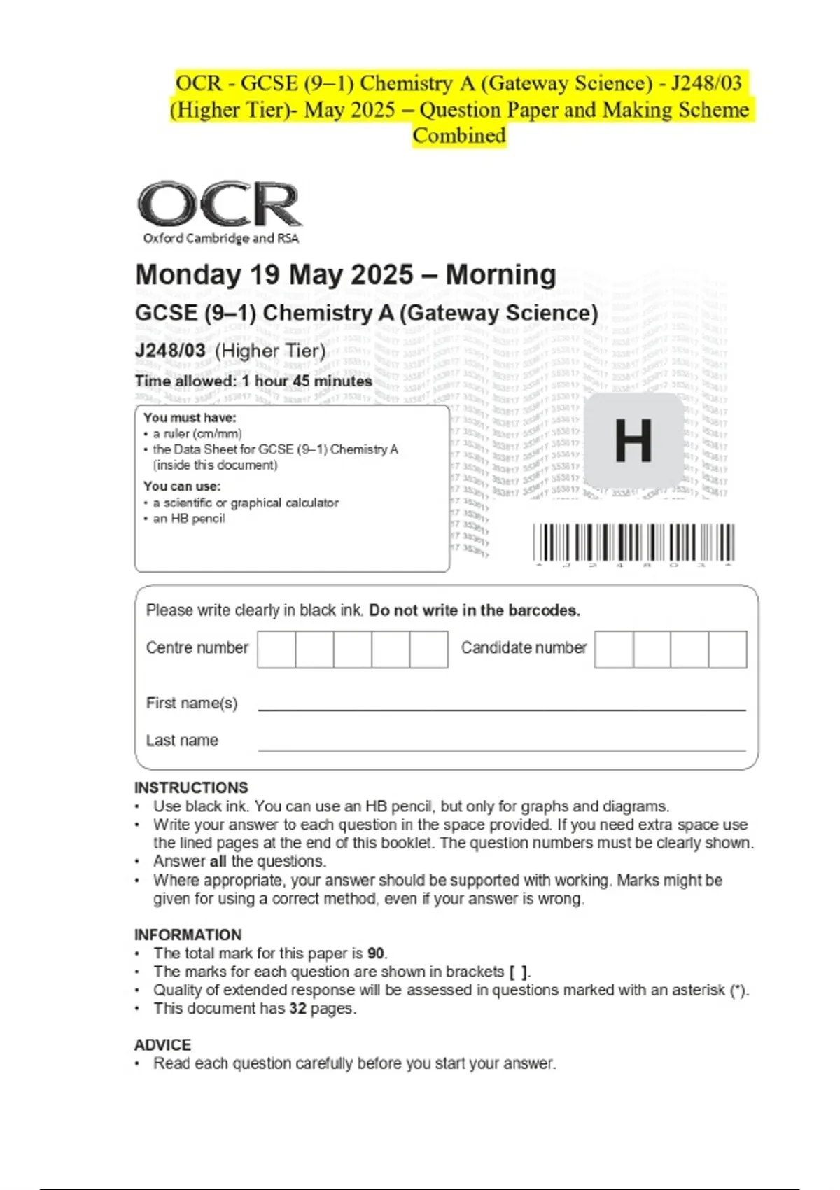 OCR - GCSE (9–1) Chemistry A (Gateway Science) - J248/03 (Higher Tier)- May 2025 - Question Paper and Making Scheme Combined