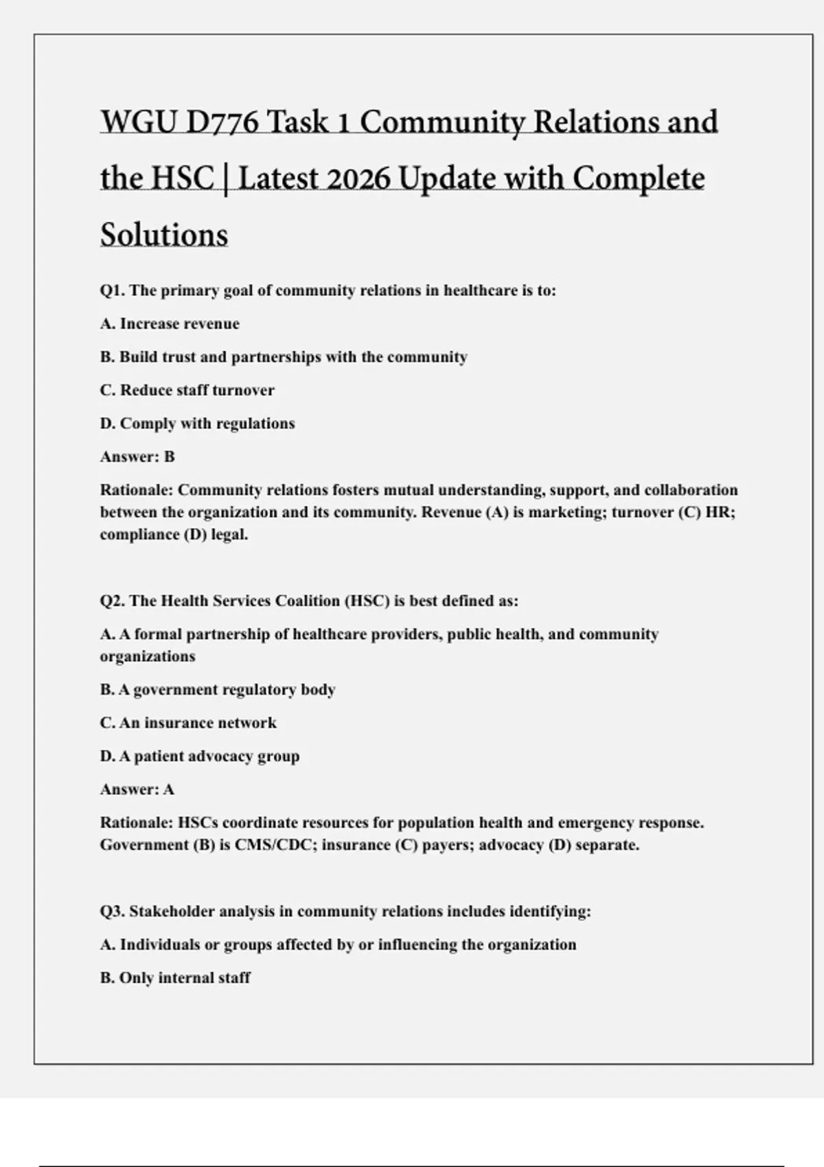 This document provides the fully updated 2026 version of WGU’s D776 Task 1 for Community Relations and the Health Services Coordinator (HSC), including complete and detailed solutions. It explains all required components such as community assessment, stakeholder engagement, communication strategies, and evaluation of community-based initiatives. The content is structured to align with current course expectations and supports students in understanding each task element clearly and accurately.