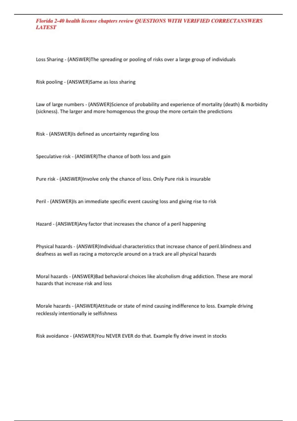 Elements of Insurance risk - (ANSWER)Definate and measurable 2. Predictable 3.cannot be catastrophic