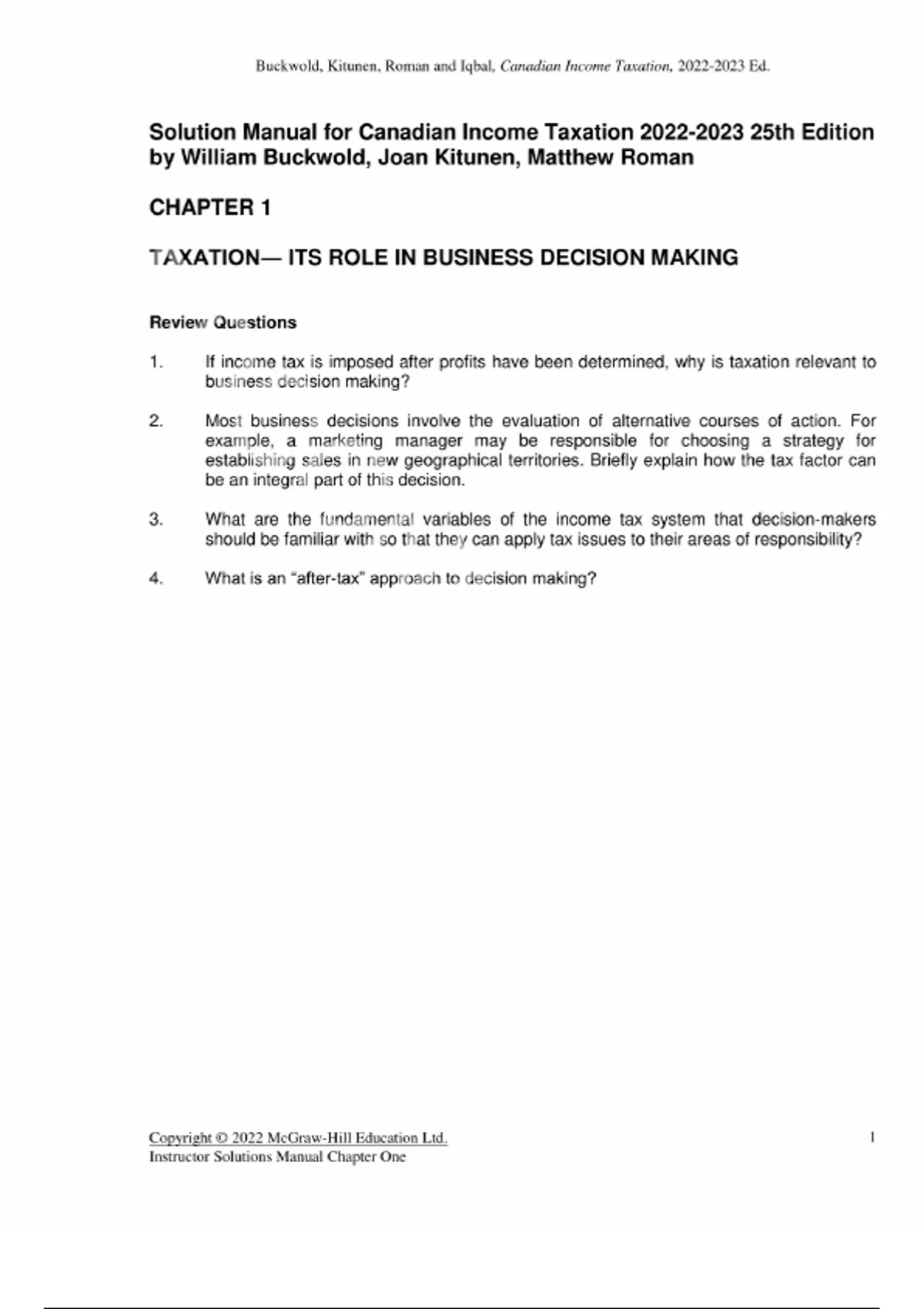 This document provides the complete solution manual for Canadian Income Taxation 2022–2023 (25th Edition) by William Buckwold, Joan Kitunen, and Matthew Roman. It includes detailed solutions to all review questions, key concept questions, and practice problems across the textbook. Topics covered include tax planning, tax liability, income determination, GAAR (General Anti-Avoidance Rule), residency status, business structures, personal and corporate taxation, and administration of the Canadian income tax system. This resource is ideal for students preparing for CPA exams or university-level tax courses in Canada.