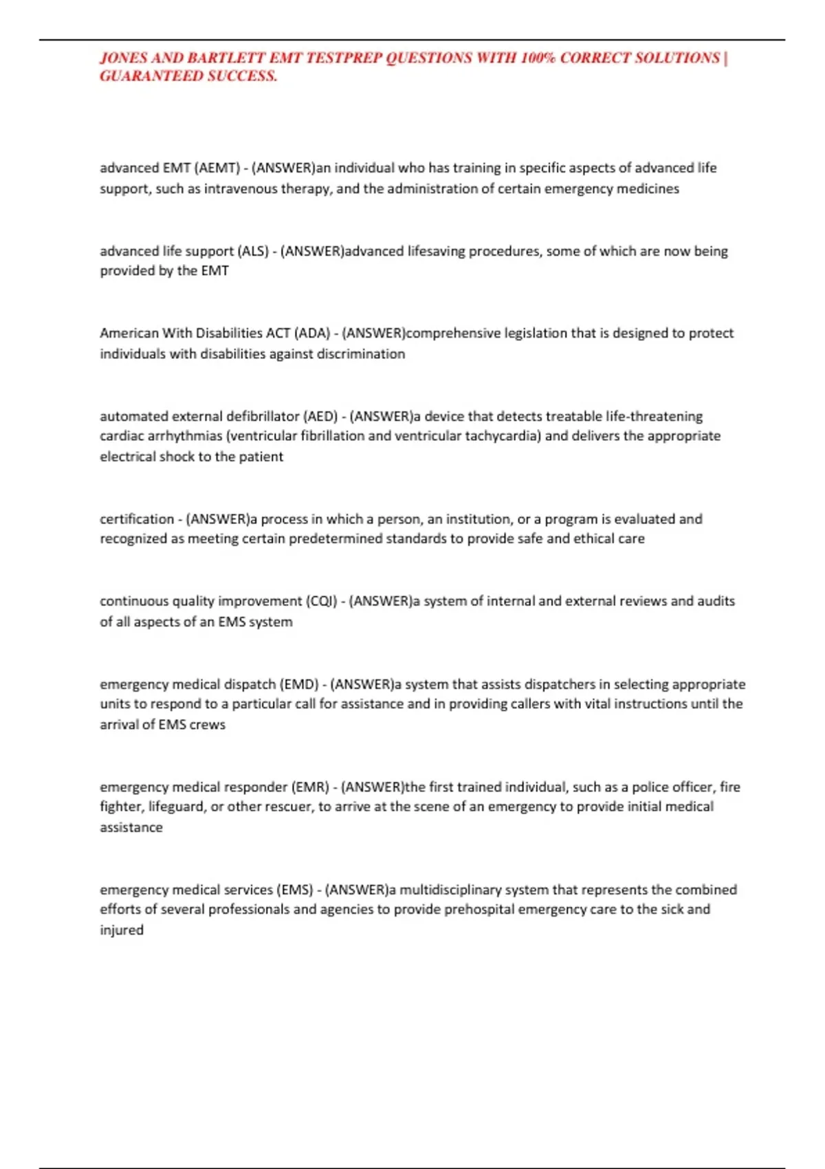 JONES AND BARTLETT EMT TESTPREP QUESTIONS WITH 100% CORRECT SOLUTIONS | GUARANTEED SUCCESS.