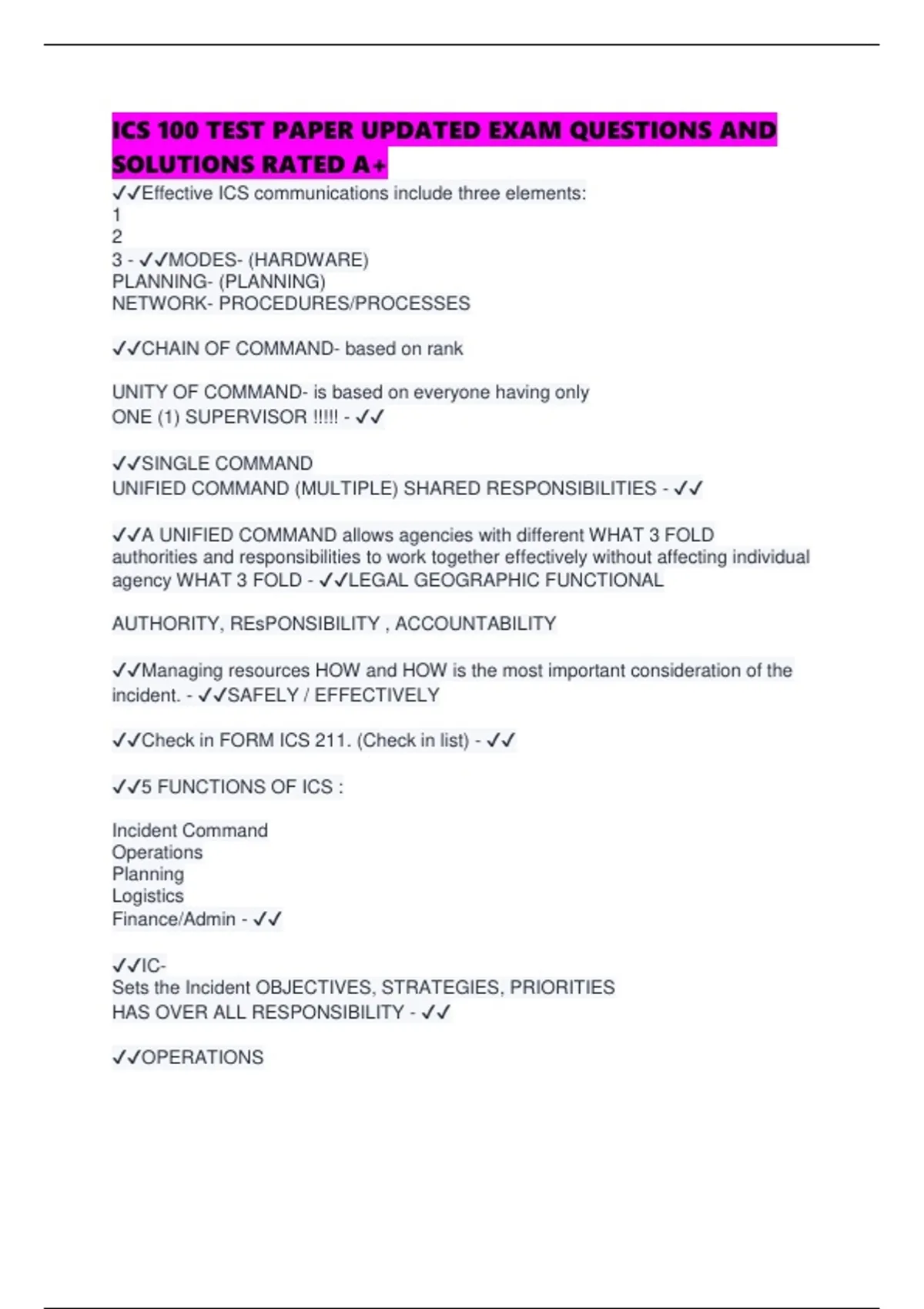 ICS 100 TEST PAPER UPDATED EXAM QUESTIONS AND SOLUTIONS RATED A+