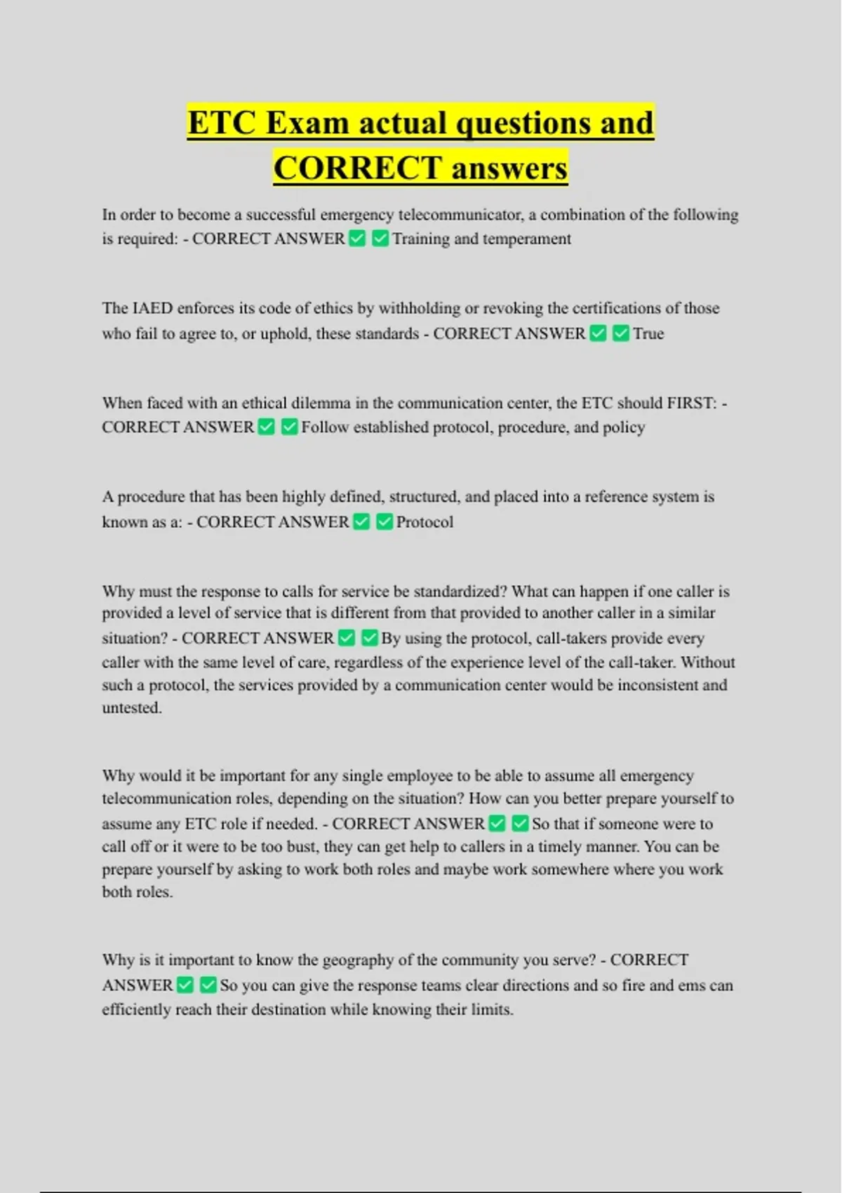 ETC Exam actual questions and CORRECT answers In order to become a successful emergency telecommunicator, a combination of the following is required: - CORRECT ANSWER Training and temperament The IAED enforces its code of ethics by withholding or revoking the certifications of those who fail to agree to, or uphold, these standards - CORRECT ANSWER True When faced with an ethical dilemma in the communication center, the ETC should FIRST: - CORRECT ANSWER Follow established protocol, procedure, and policy A procedure that has been highly defined, structured, and placed into a reference system is known as a: - CORRECT ANSWER Protocol Why must the response to calls for service be standardized? What can happen if one caller is provided a level of service that is different from that provided to another caller in a similar situation? - CORRECT ANSWER By using the protocol, call-takers provide every caller with the same level of care, regardless of the experience level of the call-taker. Without such a protocol, the services provided by a communication center would be inconsistent and untested. Why would it be important for any single employee to be able to assume all emergency telecommunication roles, depending on the situation? How can you better prepare yourself to assume any ETC role if needed. - CORRECT ANSWER So that if someone were to call off or it were to be too bust, they can get help to callers in a timely manner. You can be prepare yourself by asking to work both roles and maybe work somewhere where you work both roles.