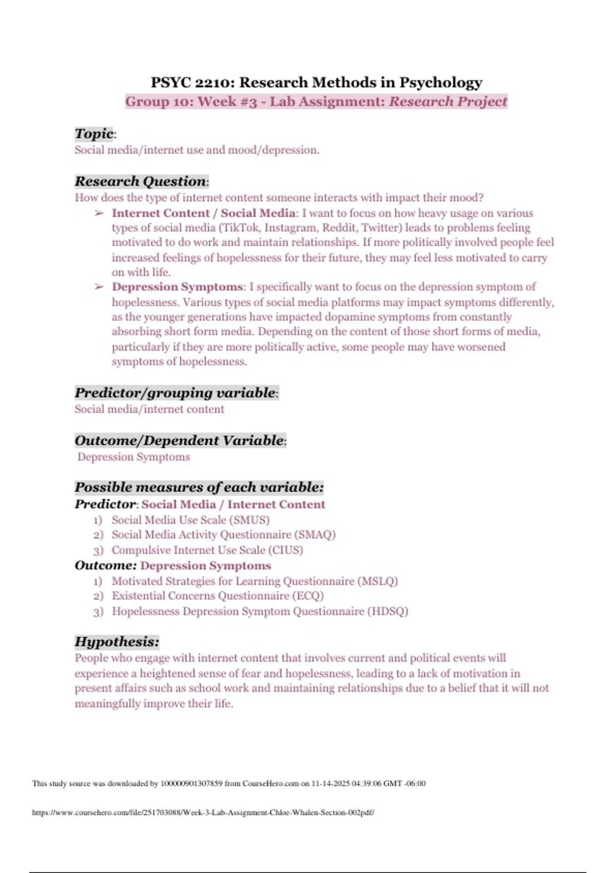 East Carolina University PSYC 2210: Research Methods in Psychology Group 10: Week #3 - Lab Assignment: Research Project