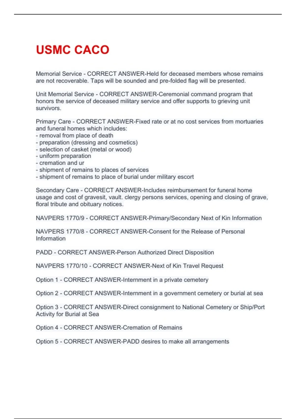 Memorial Service - CORRECT ANSWER-Held for deceased members whose remains are not recoverable. Taps will be sounded and pre-folded flag will be presented. Unit Memorial Service - CORRECT ANSWER-Ceremonial command program that honors the service of deceased military service and offer supports to grieving unit survivors. Primary Care - CORRECT ANSWER-Fixed rate or at no cost services from mortuaries and funeral homes which includes: - removal from place of death - preparation (dressing and cosmetics) - selection of casket (metal or wood) - uniform preparation - cremation and ur - shipment of remains to places of services - shipment of remains to place of burial under military escort Secondary Care - CORRECT ANSWER-Includes reimbursement for funeral home usage and cost of gravesit, vault. clergy persons services, opening and closing of grave, floral tribute and obituary notices. NAVPERS 1770/9 - CORRECT ANSWER-Primary/Secondary Next of Kin Information NAVPERS 1770/8 - CORRECT ANSWER-Consent for the Release of Personal Information PADD - CORRECT ANSWER-Person Authorized Direct Disposition NAVPERS 1770/10 - CORRECT ANSWER-Next of Kin Travel Request Option 1 - CORRECT ANSWER-Internment in a private cemetery