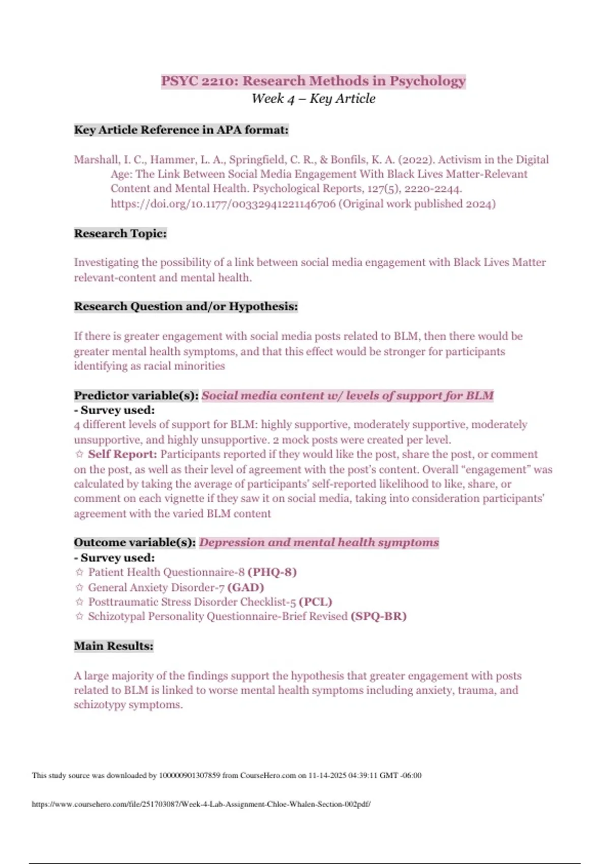 East Carolina University PSYC 2210: Week #4 Lab Assignment PSYC 2210: Research Methods in Psychology Week 4 – Key Article