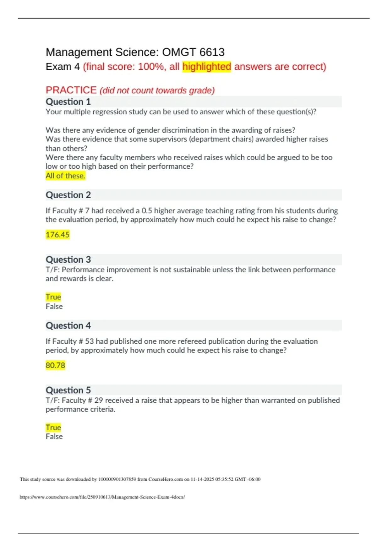 Management Science: OMGT 6613 Exam 4 (final score: 100%, all highlighted answers are correct)