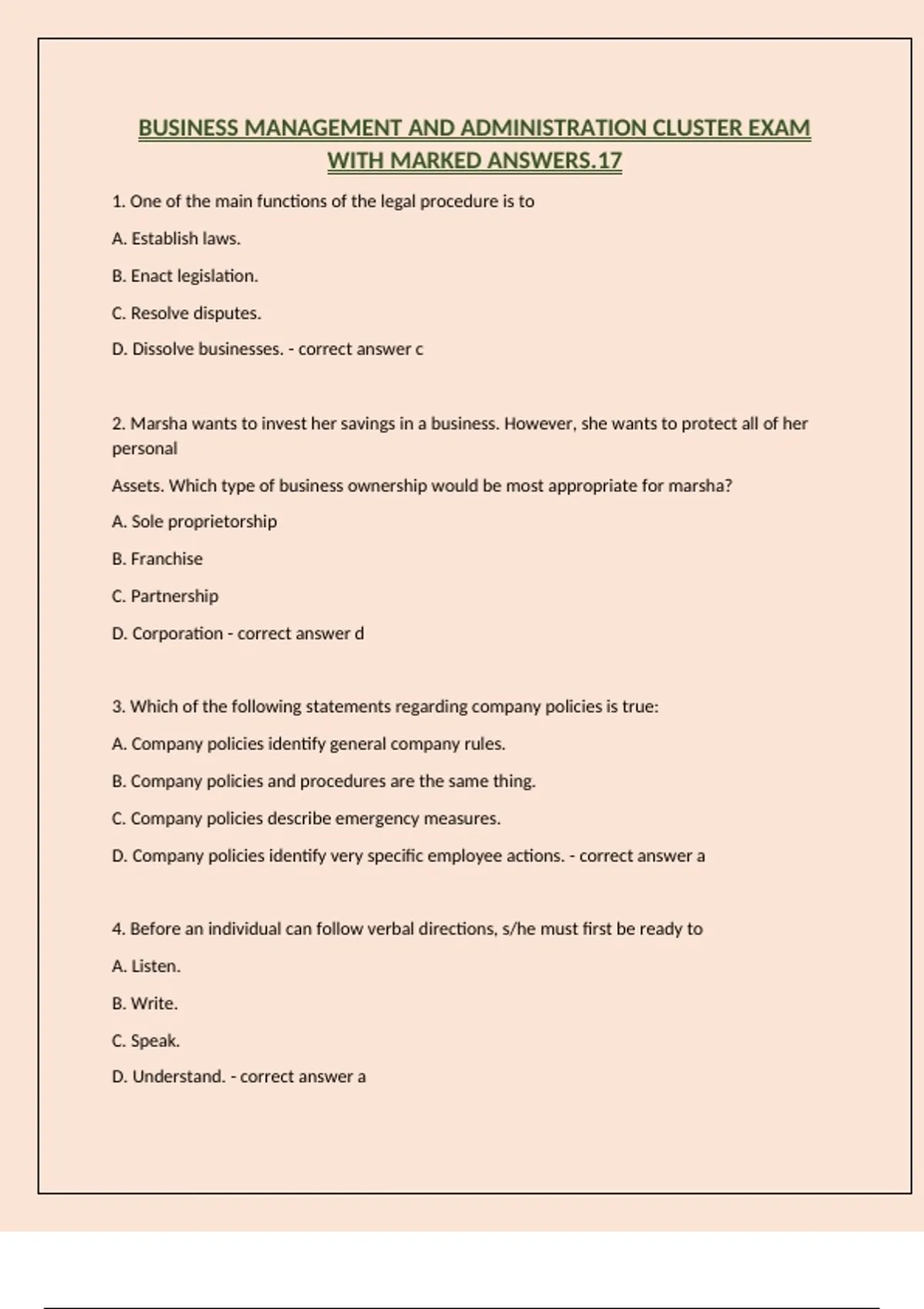 BUSINESS MANAGEMENT AND ADMINISTRATION CLUSTER EXAM WITH MARKED ANSWERS.