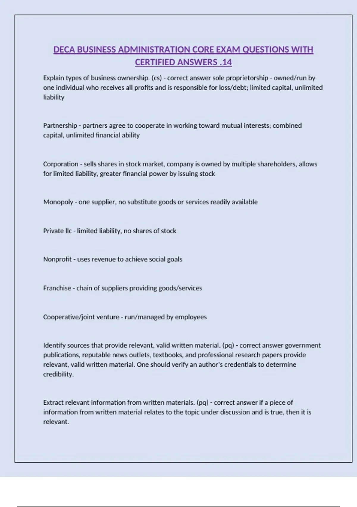DECA BUSINESS ADMINISTRATION CORE EXAM QUESTIONS WITH