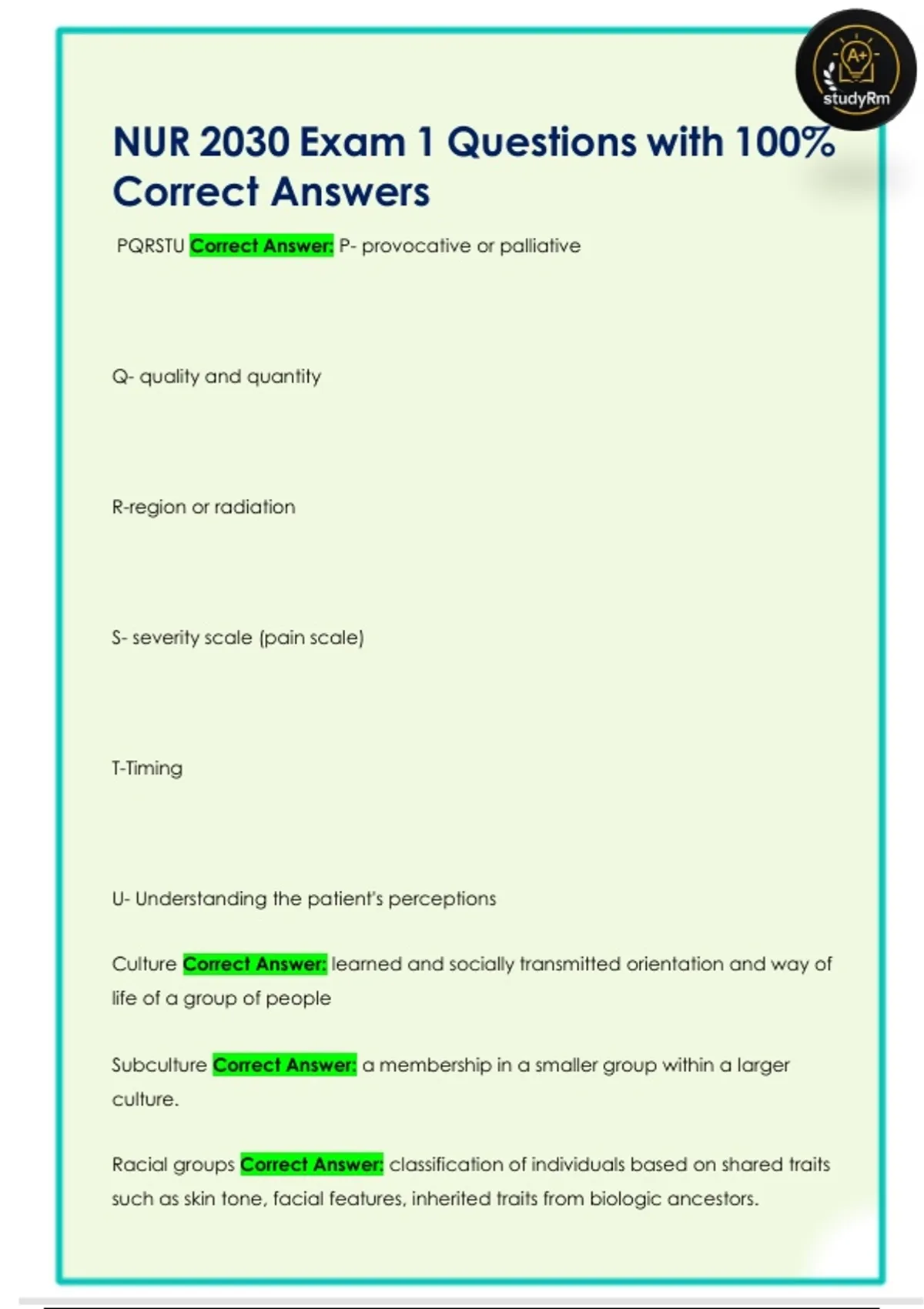 PQRSTU Correct Answer: P- provocative or palliative