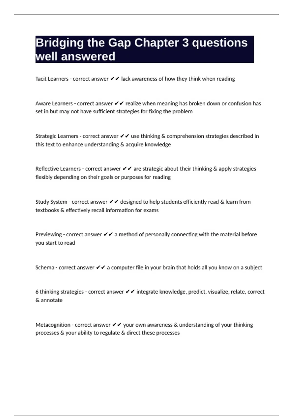 Strategic Learners - correct answer ✔✔ use thinking & comprehension strategies described in