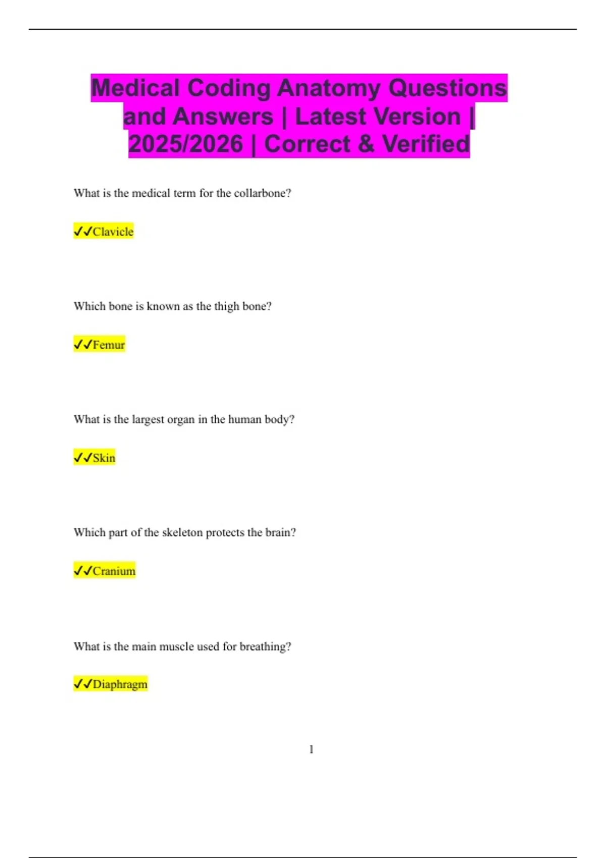 Medical Coding Anatomy Questions and Answers | Latest Version | 2025/2026 | Correct & Verified What is the medical term for the collarbone? Clavicle Which bone is known as the thigh bone? Femur What is the largest organ in the human body? Skin Which part of the skeleton protects the brain? Cranium What is the main muscle used for breathing? Diaphragm 2 Which organ is responsible for filtering blood and producing urine? Kidney What is the functional unit of the kidney called? Nephron Which bone forms the front of the lower leg? Tibia Which part of the brain controls balance and coordination? Cerebellum What is the medical term for the shoulder blade? Scapula Which organ is primarily responsible for producing insulin? Pancreas 3 What is the smallest bone in the human body? Stapes Which chamber of the heart receives deoxygenated blood from the body? Right atrium Which type of joint is found at the elbow and knee? Hinge joint Which organ is responsible for pumping blood throughout the body? Heart What is the medical term for the kneecap? Patella Which bone forms the upper jaw? Maxilla 4 Which type of tissue connects muscles to bones? Tendon Which lobe of the brain is responsible for vision? Occipital lobe Which organ stores bile produced by the liver? Gallbladder Which blood vessels carry oxygenated blood away from the heart? Arteries What is the largest artery in the body? Aorta