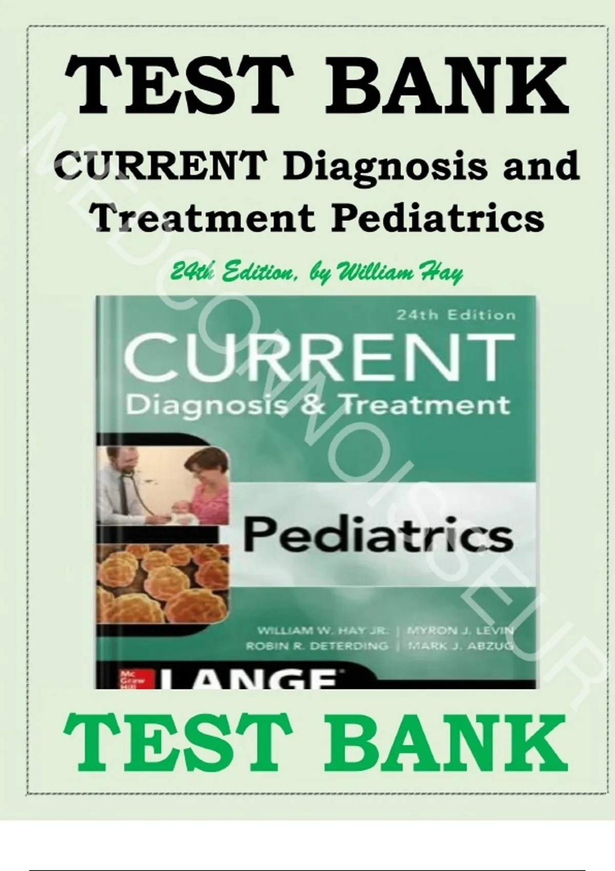 This document contains the complete test bank for Current Diagnosis and Treatment: Pediatrics (24th Edition) by William Hay. It features hundreds of multiple-choice and multiple-response questions with correct answers and rationales, spanning all textbook chapters. Topics include newborn and adolescent care, immunizations, nutrition, pediatric emergencies, infectious diseases, psychiatric and behavioral disorders, child abuse, and more. This resource is aligned with the full textbook and is ideal for medical students, nursing students, and pediatric professionals preparing for exams or clinical evaluations.