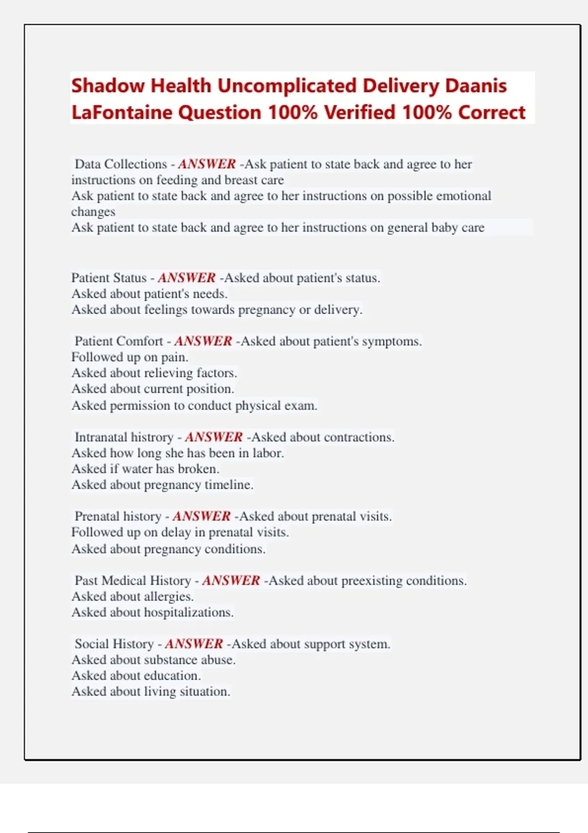 Shadow Health Uncomplicated Delivery Daanis LaFontaine Question 100% Verified 100% Correct Data Collections - ANSWER -Ask patient to state back and agree to her instructions on feeding and breast care Ask patient to state back and agree to her instructions on possible emotional changes Ask patient to state back and agree to her instructions on general baby care Patient Status - ANSWER -Asked about patient's status. Asked about patient's needs. Asked about feelings towards pregnancy or delivery. Patient Comfort - ANSWER -Asked about patient's symptoms. Followed up on pain. Asked about relieving factors. Asked about current position. Asked permission to conduct physical exam. Intranatal histrory - ANSWER -Asked about contractions. Asked how long she has been in labor. Asked if water has broken. Asked about pregnancy timeline. Prenatal history - ANSWER -Asked about prenatal visits. Followed up on delay in prenatal visits. Asked about pregnancy conditions. Past Medical History - ANSWER -Asked about preexisting conditions. Asked about allergies. Asked about hospitalizations. Social History - ANSWER -Asked about support system. Asked about substance abuse. Asked about education. Asked about living situation. Assessed who will be primary caregiver. Home Medications - ANSWER -Asked about home medications. Review of Systems - ANSWER -Asked about review of gastrointestinal system. Asked about review of urinary system. Asked about review of cardiovascular system. Education and Empathy - ANSWER -Water Breaking Pain Feeling Nervous Nursing Diagnosis - ANSWER -readiness for effective parenting Signs and Symptoms - ANSWER -expresses desire to learn about baby care expresses desire to learn about feeding and breast care expresses desire to learn about possible emotional changes Short term goal - ANSWER -To have the patient, within her visit at the hospital, state back and agree to all the post-delivery instructions you will provide. Interventions - ANSWER -Address the baby's cries as soon as possible, focusing first on hunger, diaper checks, temperature, sleep, and emotional support Ensure baby sleeps in the bassinet, on his back, never in your bed. Remove toys, pillows, or other smothering or overheating hazards from his bassinet Call the physician or visit the hospital if your baby exhibits abnormal symptoms like diarrhea, fever, difficulty breathing, refusal/difficulty with feeding, or if your baby produces fewer wet and soiled diapers than expected Baby should be fed on demand, at least 8 times a day. Wake baby if necessary Fully empty your breast during feeding to avoid soreness and engorgement, alternating breast used Normal emotional changes, like irritability or the "baby blues," may occur and then pass without limiting your ability to take care of and bond with your baby In 1 or 2 sentences, explain how your selected interventions work to accomplish your goal. - ANSWER -These interventions provide Daanis with a thorough and correct understanding of baby care, breastfeeding and breast care, and possible emotional changes. Your instructions cover a broad array of topics from everyday practices to what to do in rare scenarios.