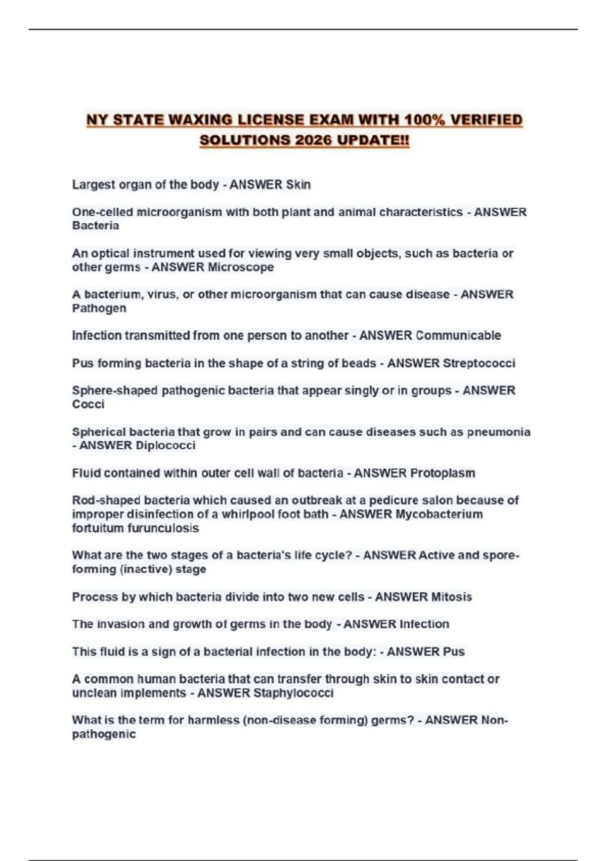 NY STATE WAXING LICENSE EXAM WITH 100% VERIFIED SOLUTIONS 2026 UPDATE!!...