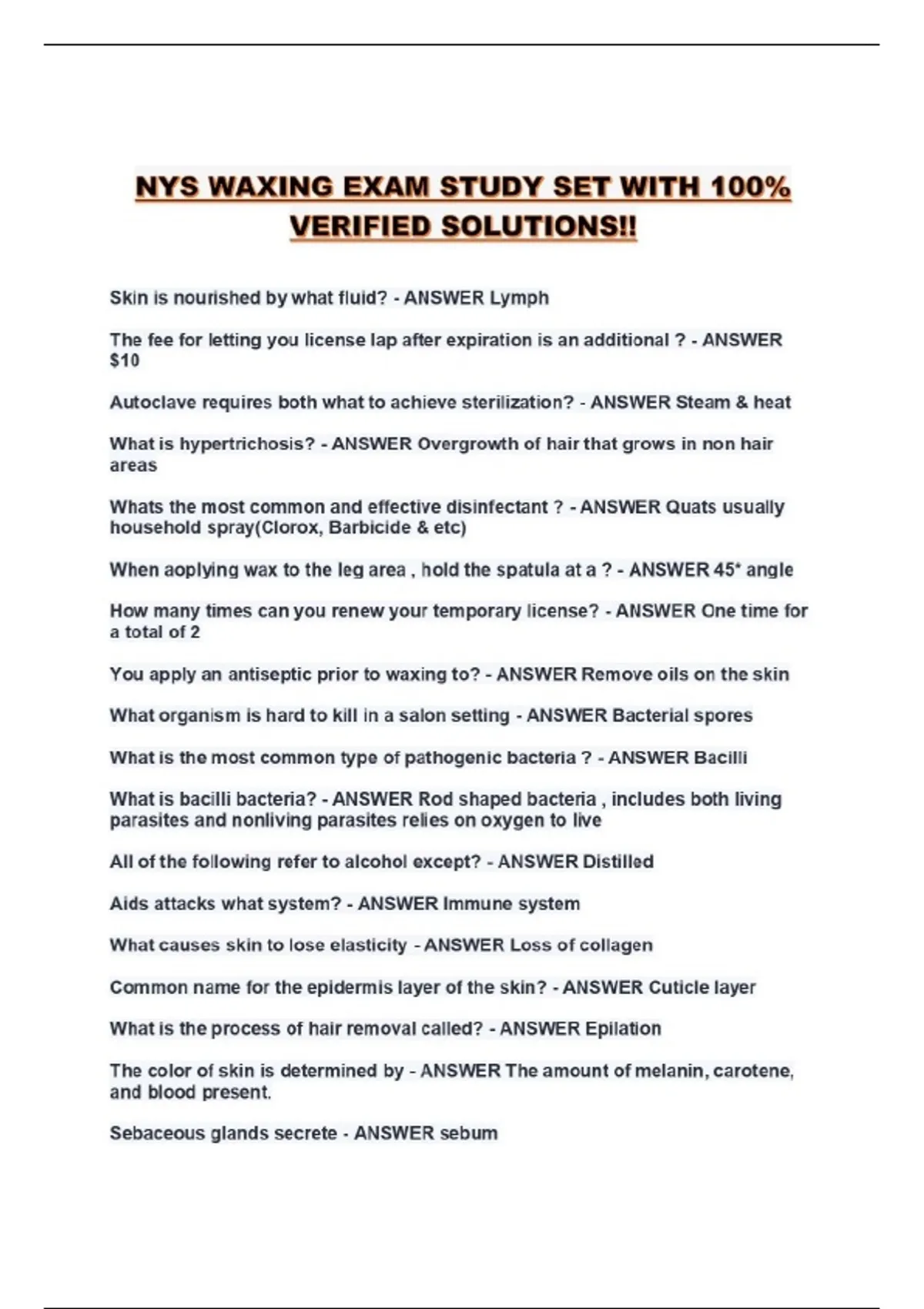 NYS WAXING EXAM STUDY SET WITH 100% VERIFIED SOLUTIONS!!...