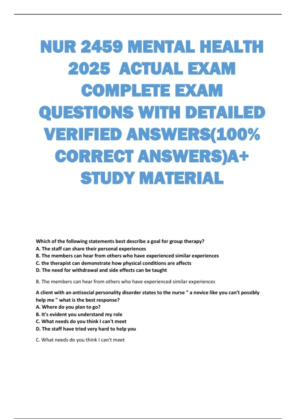 NUR 2459 MENTAL HEALTH 2025 ACTUAL EXAM COMPLETE EXAM QUESTIONS WITH DETAILED VERIFIED ANSWERS(100% CORRECT ANSWERS)A+ STUDY MATERIAL