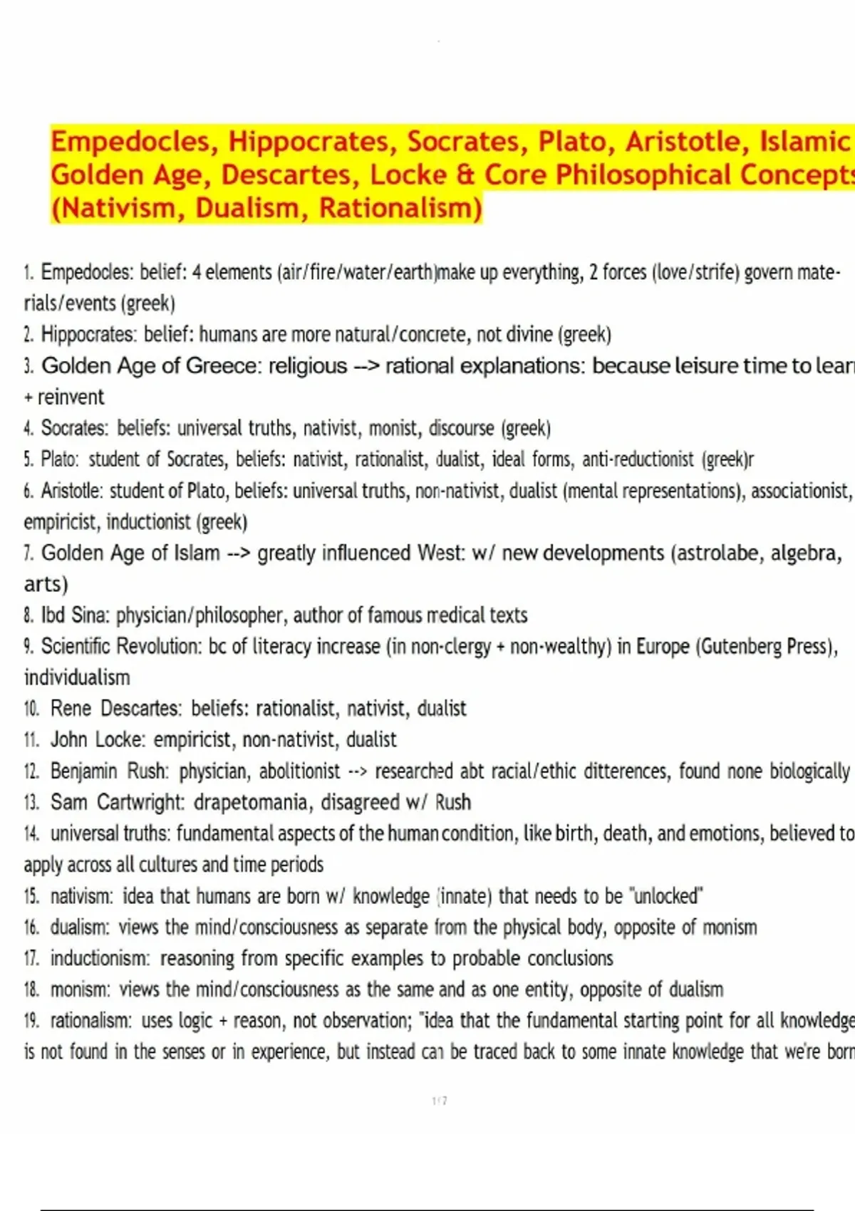 Empedocles, Hippocrates, Socrates, Plato, Aristotle, Islamic Golden Age, Descartes, Locke & Core Philosophical Concepts (Nativism, Dualism, Rationalism).pdf