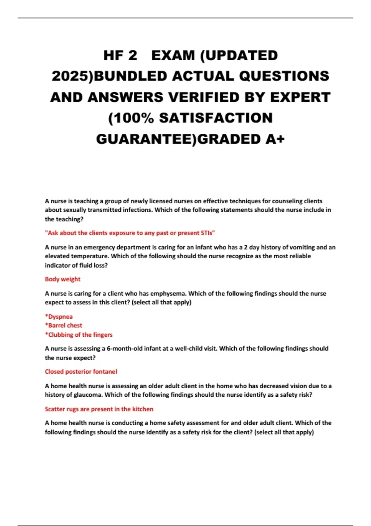 HF 2 EXAM (UPDATED 2025)BUNDLED ACTUAL QUESTIONS AND ANSWERS VERIFIED BY EXPERT (100% SATISFACTION GUARANTEE)GRADED A+