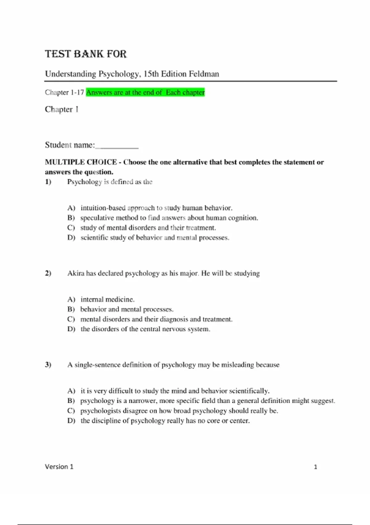 This document contains the full test bank for Understanding Psychology (15th Edition) by Robert Feldman. It includes hundreds of multiple-choice, true/false, fill-in-the-blank, and short-answer questions with answer keys provided at the end of each chapter. The content spans 17 chapters and covers foundational psychological concepts including major perspectives, scientific research methods, brain and behavior, development, sensation, learning, memory, personality, psychological disorders, therapy, and social behavior. Ideal for psychology students and instructors preparing for exams, quizzes, and review sessions. Contents: Chapter 1: Introduction to Psychology Chapter 2: Psychological Research Chapter 3: Neuroscience and Behavior Chapter 4: Sensation and Perception Chapter 5: States of Consciousness Chapter 6: Learning Chapter 7: Memory Chapter 8: Cognition and Language Chapter 9: Intelligence Chapter 10: Motivation and Emotion Chapter 11: Sexuality and Gender Chapter 12: Development Chapter 13: Personality Chapter 14: Health Psychology: Stress, Coping, and Well-Being Chapter 15: Psychological Disorders Chapter 16: Treatment of Psychological Disorders Chapter 17: Social Psychology