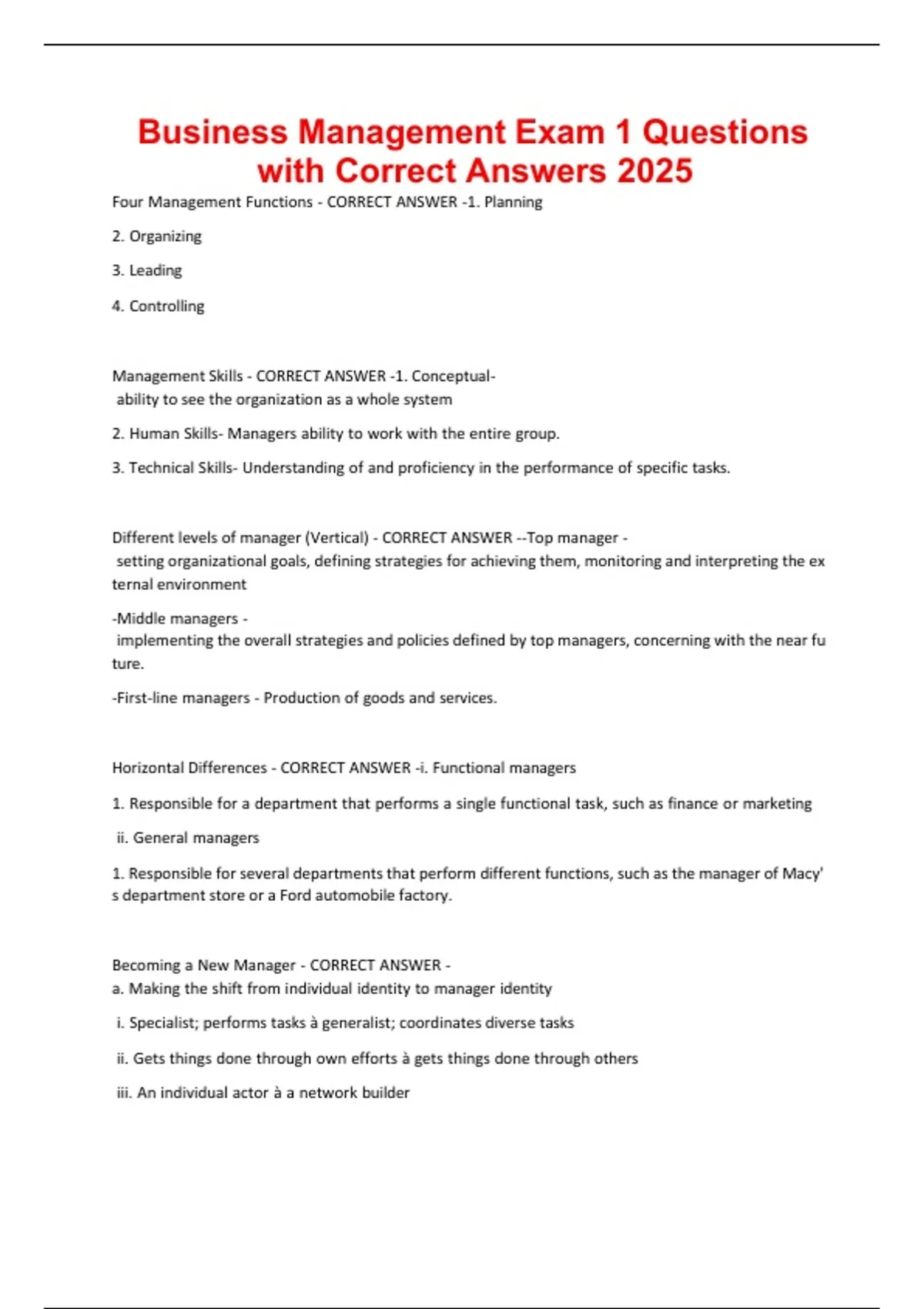 Business Management Exam 1 Questions with Correct Answers 2025.