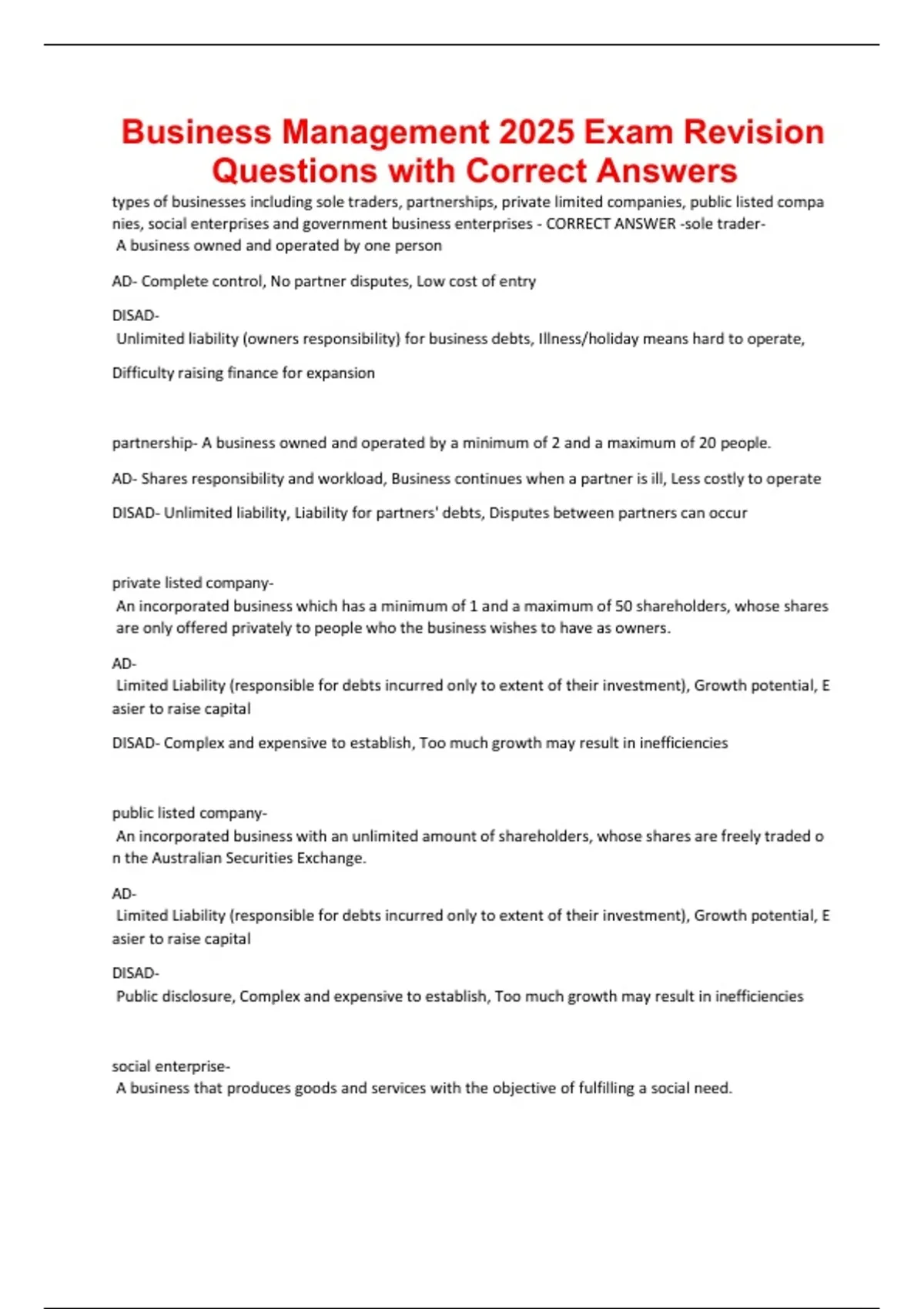 Business Management 2025 Exam Revision Questions with Correct Answers.