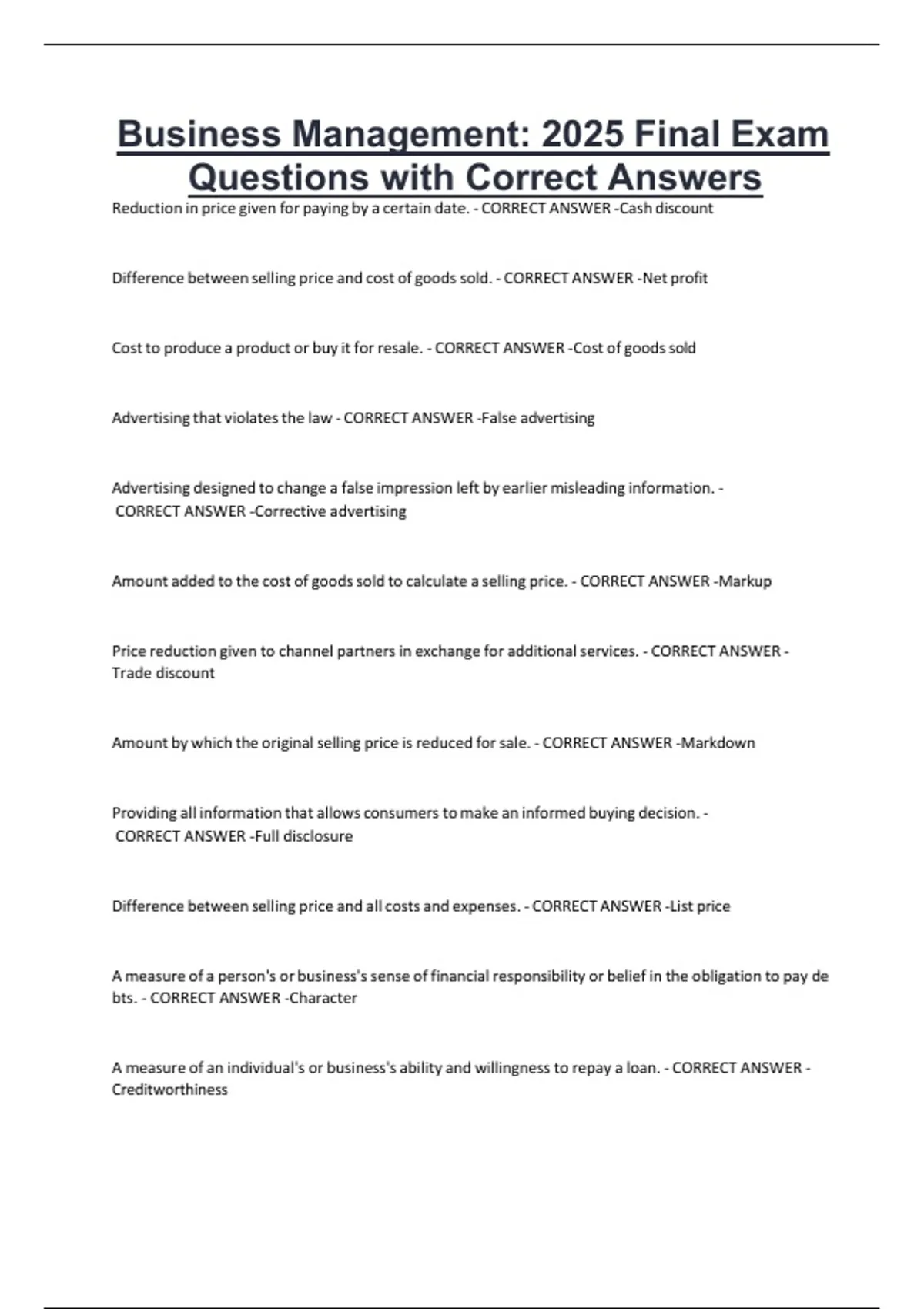Business Management 2025 Final Exam Questions with Correct Answers