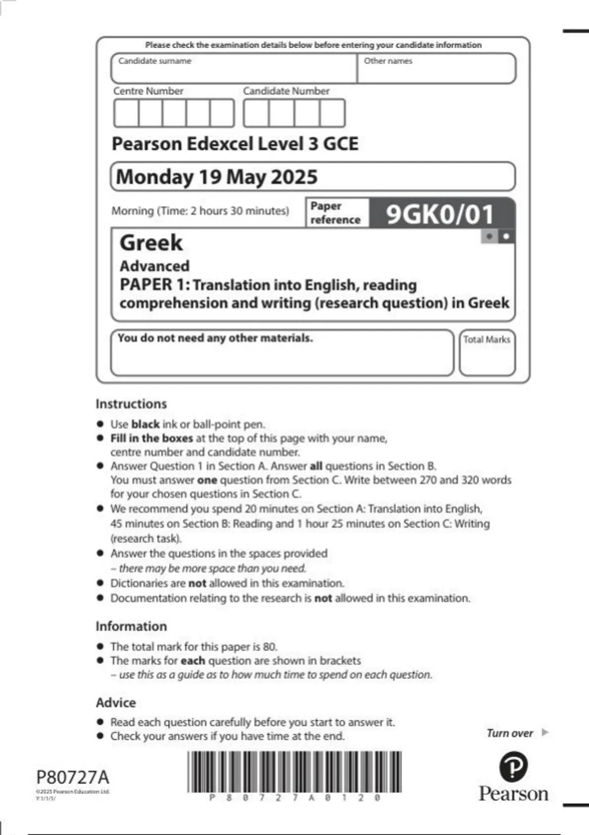 Pearson Edexcel a level Greek | question paper | 2025| 9GK0/01