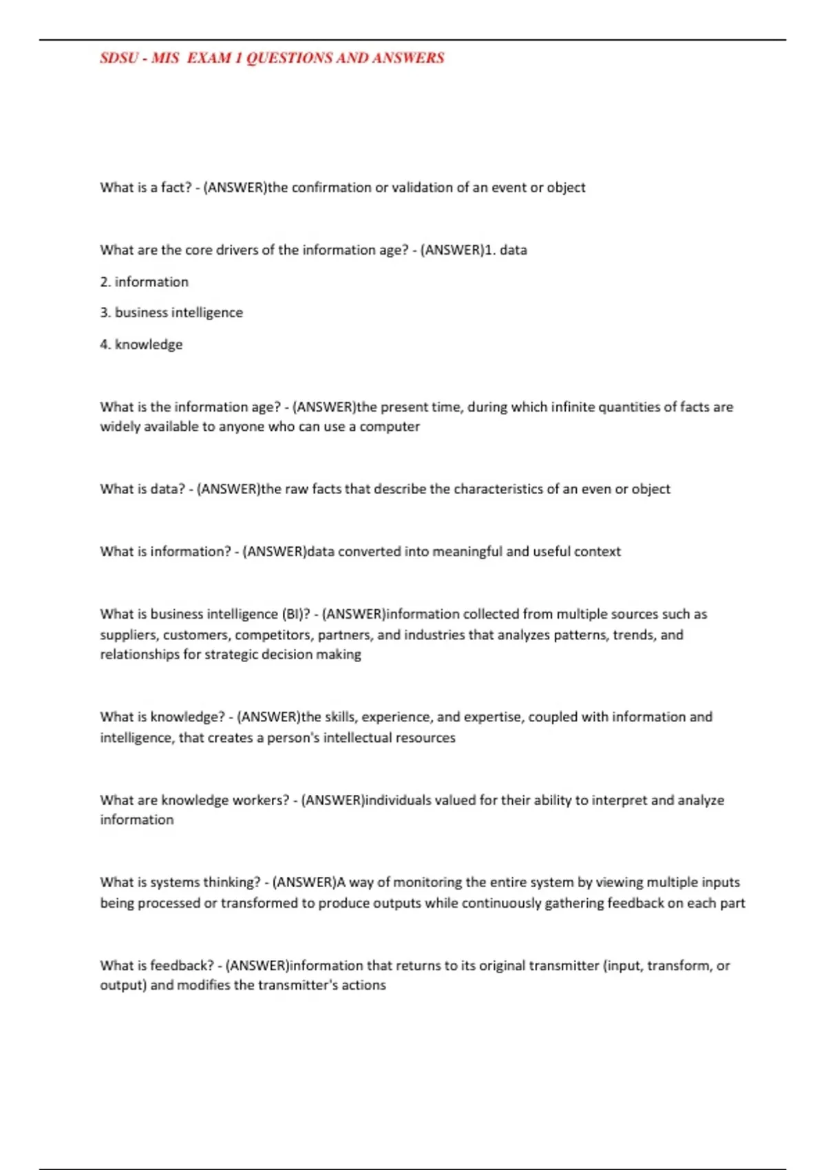 , SDSU - MIS EXAM 1 QUESTIONS AND ANSWERS