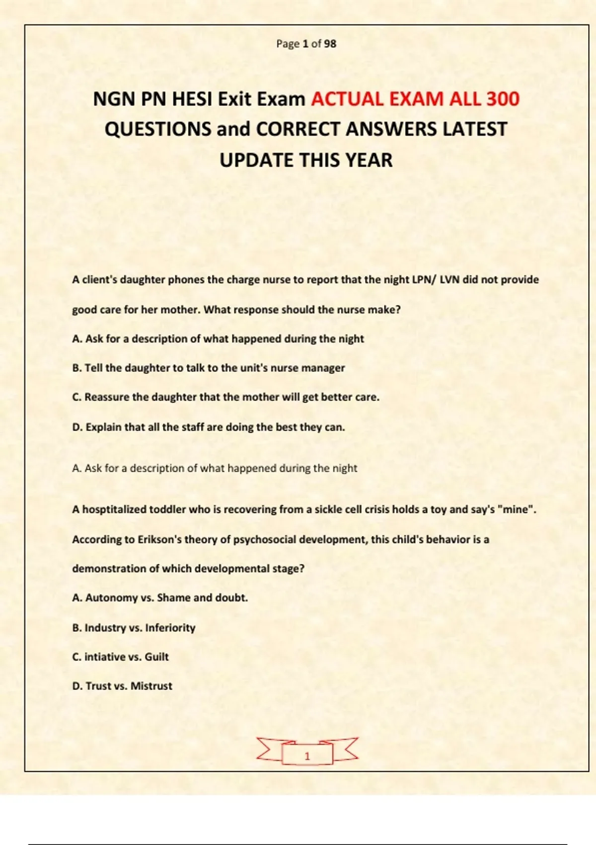 NGN PN HESI Exit Exam ACTUAL EXAM ALL 300