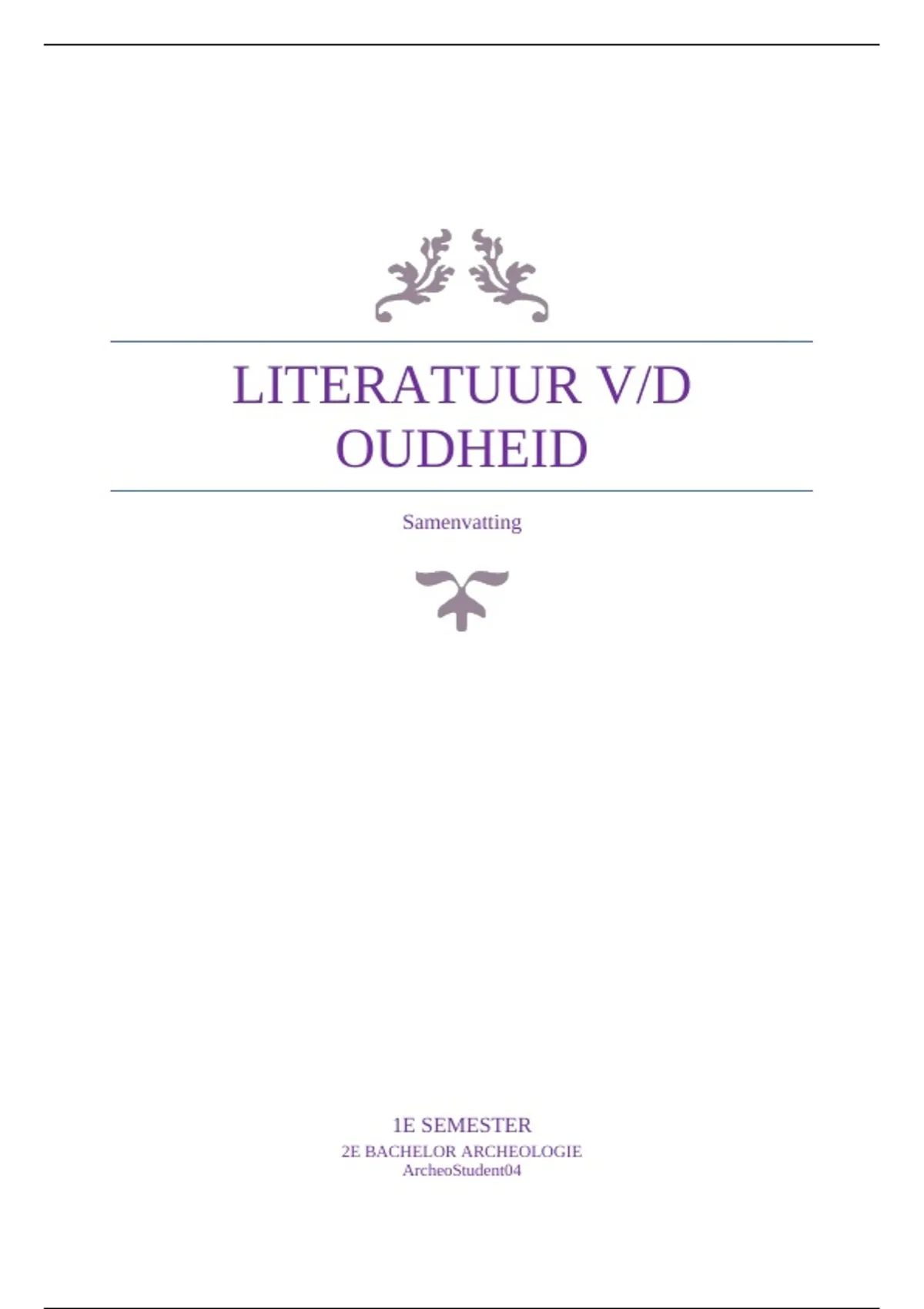 Dit document is een volledige samenvatting van het vak De Literatuur van de Oudheid. Het is geschreven aan de hand van het handboek, de powerpoint en lesnotities. Alles is volledig zelf verwoord.