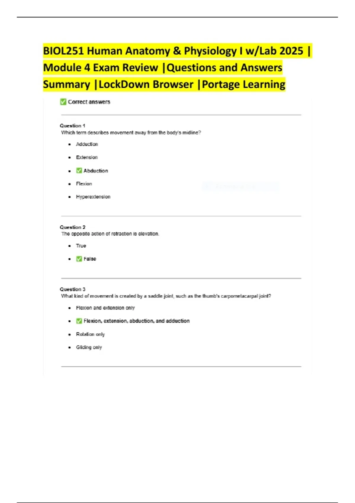 BIOL251 Human Anatomy & Physiology I w/Lab 2025 | Module 4 Exam Review |Questions and Answers Summary |LockDown Browser |Portage Learning