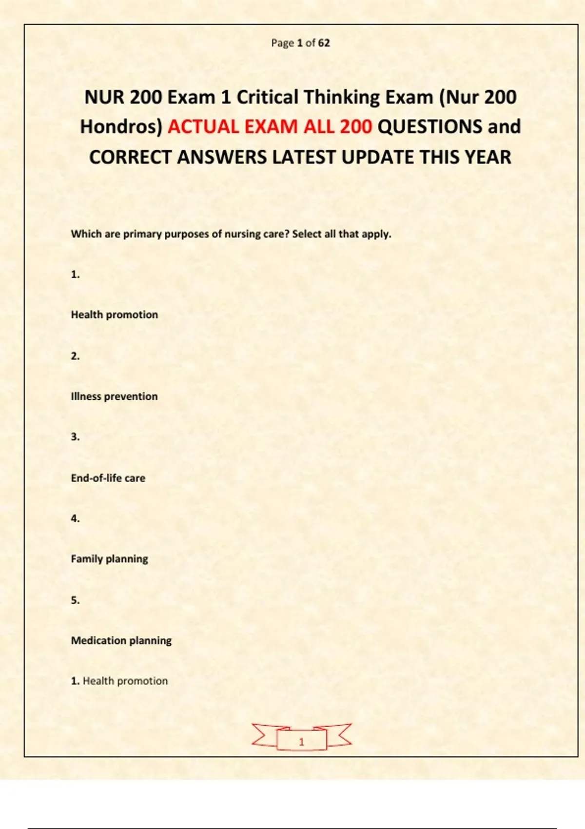NUR 200 Exam 1 Critical Thinking Exam (Nur 200