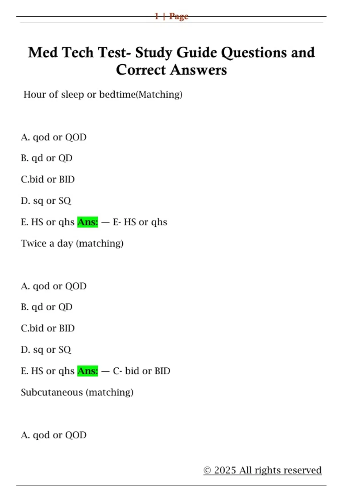 Med Tech Test- Study Guide Questions and Correct Answers Med Tech Test- Study Guide Questions and Correct Answers Med Tech Test- Study Guide Questions and Correct Answers Med Tech Test- Study Guide Questions and Correct Answers Med Tech Test- Study Guide Questions and Correct Answers Med Tech Test- Study Guide Questions and Correct Answers