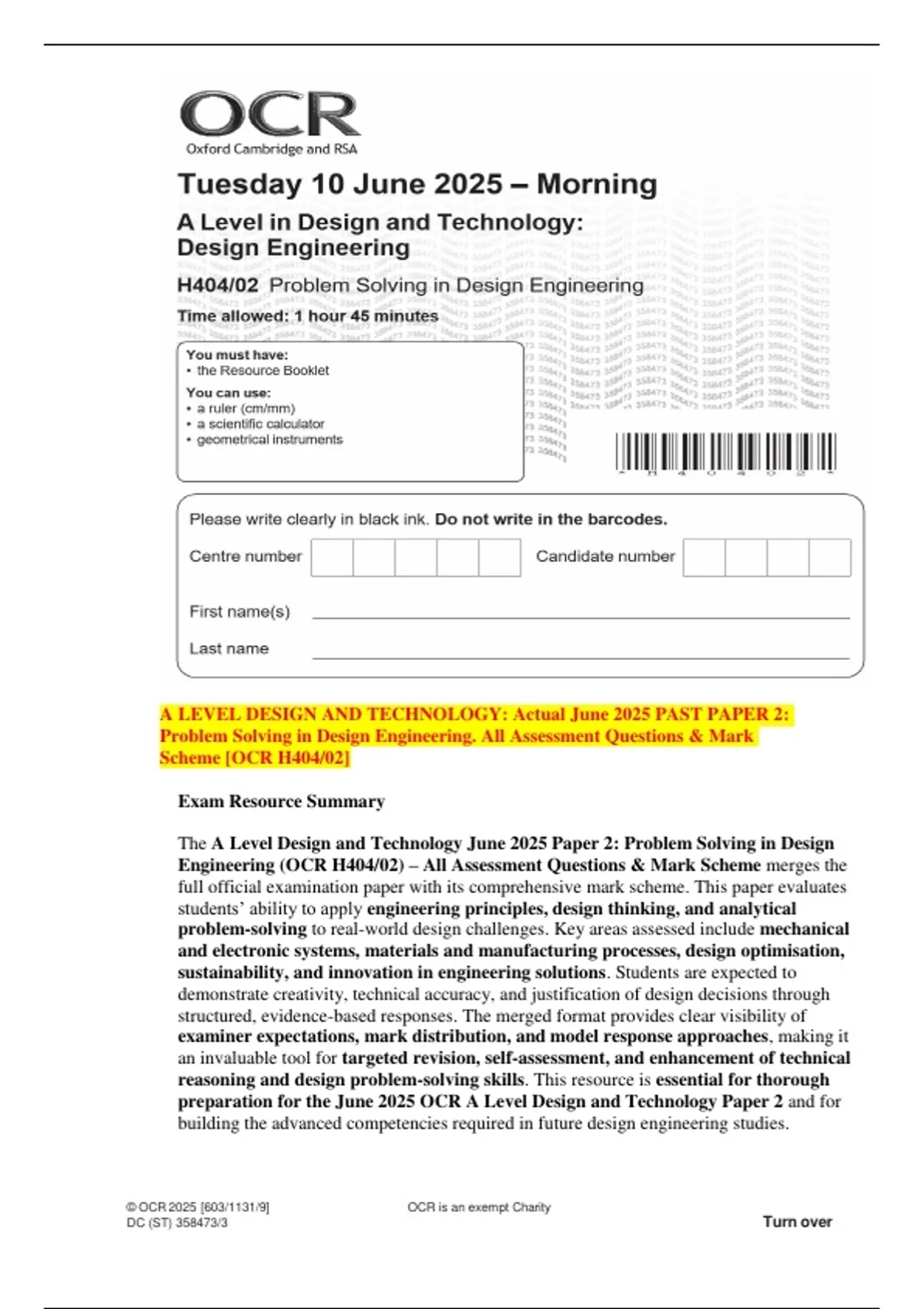 Engineering (OCR H404/02) – All Assessment Questions & Mark Scheme merges the
