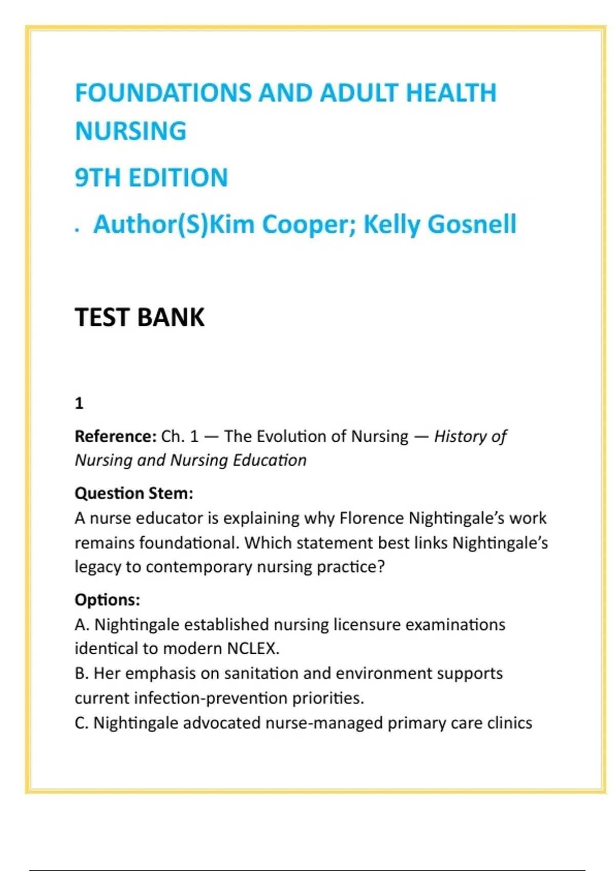 • Correct (B): Nightingale’s focus on sanitation, ventilation,