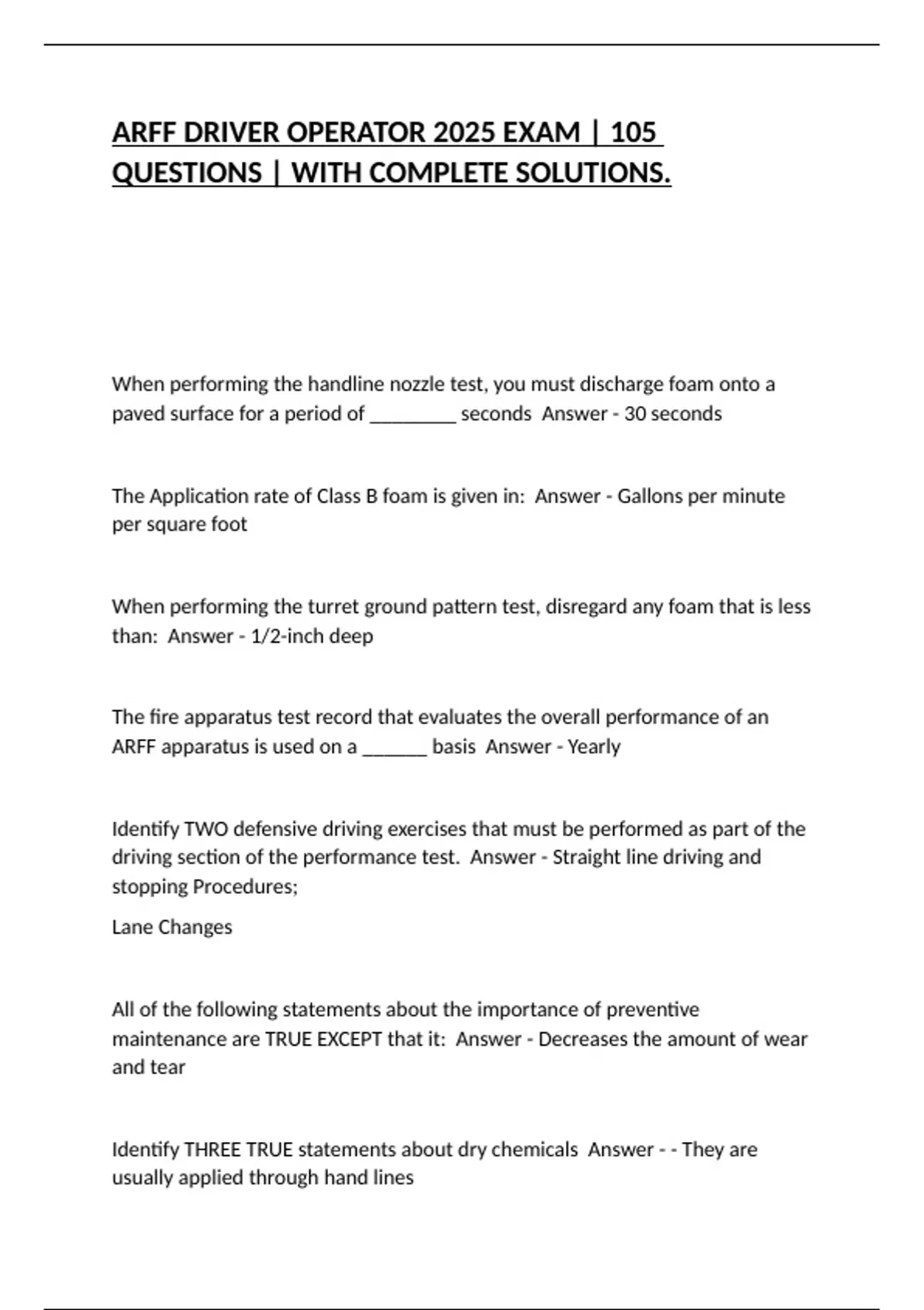 ARFF DRIVER OPERATOR 2025 EXAM | 105 QUESTIONS | WITH COMPLETE SOLUTIONS.