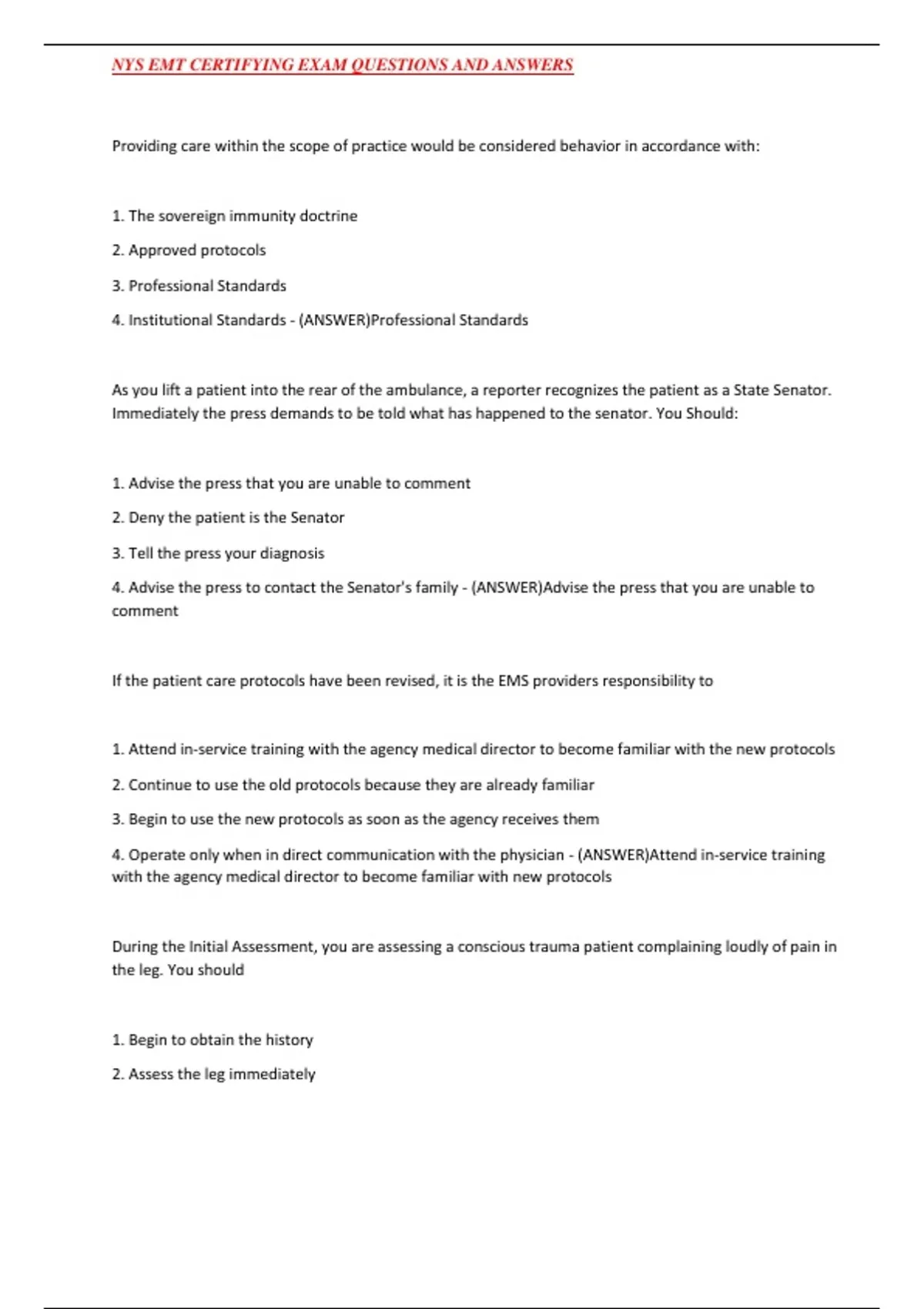 NYS EMT CERTIFYING EXAM QUESTIONS AND ANSWERS
