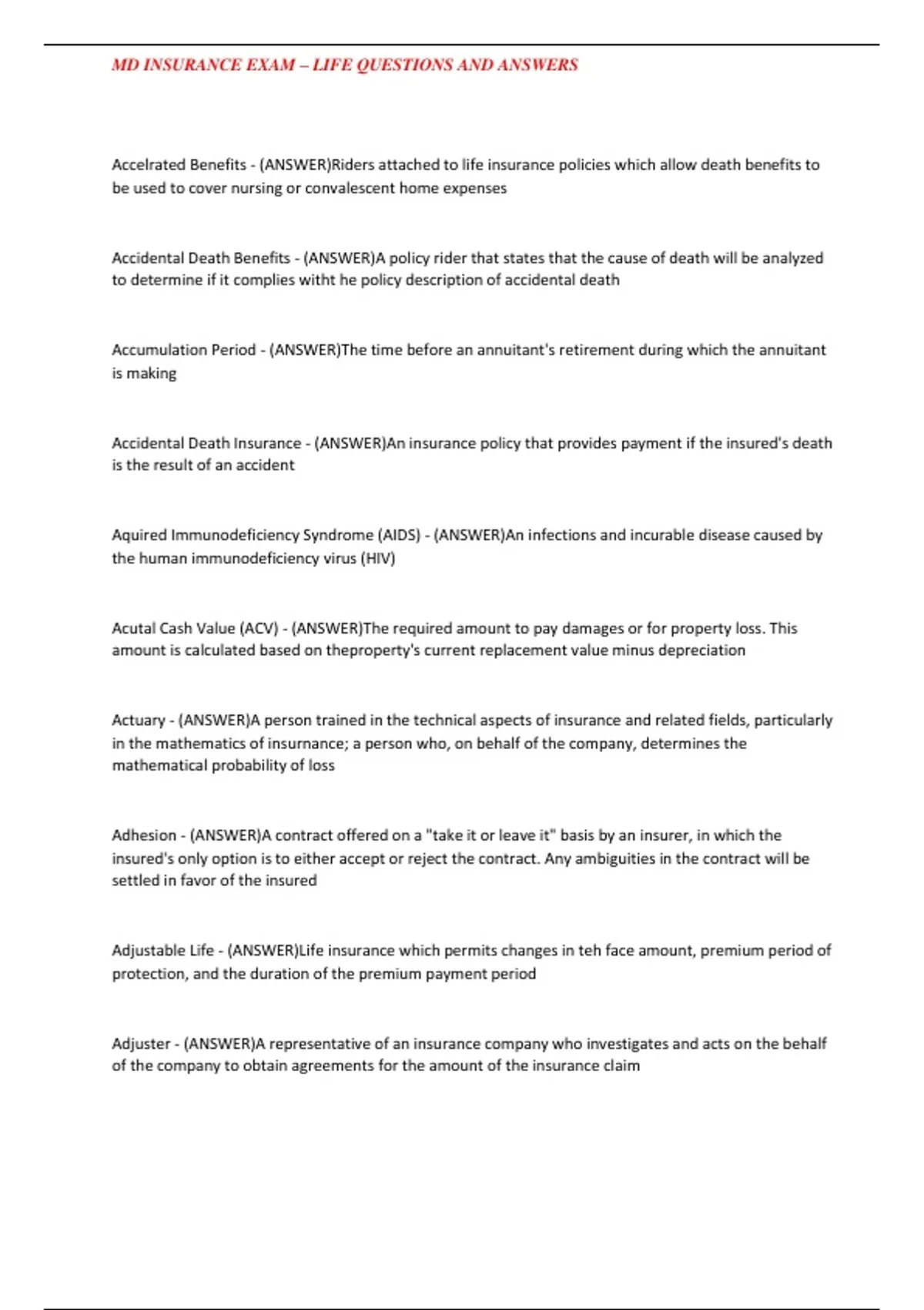 MD INSURANCE EXAM – LIFE QUESTIONS AND ANSWERS