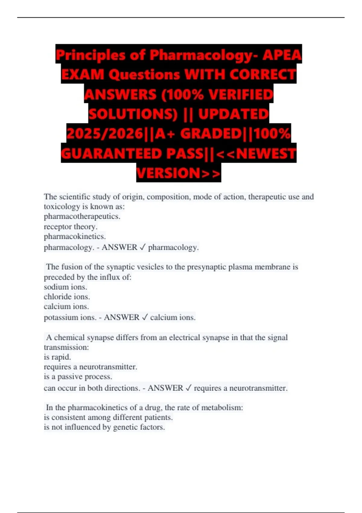 Principles of Pharmacology- APEA EXAM Questions WITH CORRECT ANSWERS (100% VERIFIED SOLUTIONS) || UPDATED 2025/2026||A+ GRADED||100% GUARANTEED PASS||NEWEST VERSION The scientific study of origin, composition, mode of action, therapeutic use and toxicology is known as: pharmacotherapeutics. receptor theory. pharmacokinetics. pharmacology. - ANSWER pharmacology. The fusion of the synaptic vesicles to the presynaptic plasma membrane is preceded by the influx of: sodium ions. chloride ions. calcium ions. potassium ions. - ANSWER calcium ions. A chemical synapse differs from an electrical synapse in that the signal transmission: is rapid. requires a neurotransmitter. is a passive process. can occur in both directions. - ANSWER requires a neurotransmitter. In the pharmacokinetics of a drug, the rate of metabolism: is consistent among different patients. is not influenced by genetic factors. is not affected by environmental factors. varies widely among patients. - ANSWER varies widely among patients. After a drug is metabolized by the liver and enters the bile, it is most likely to be: excreted in the urine. fecally excreted. bound to plasma proteins. reabsorbed into the portal vein. - ANSWER fecally excreted. The term that describes the movement of a drug among parts of the body is: biotransformation. absorption. distribution. elimination. - ANSWER distribution. Which of the following is a neurotransmitter within the parasympathetic nervous system? Epinephrine Dopamine Acetylcholine Norepinephrine - ANSWER Acetylcholine Which of the following is considered an inhibitory neurotransmitter? Acetylcholine Dopamine Glycine Norepinephrine - ANSWER Glycine